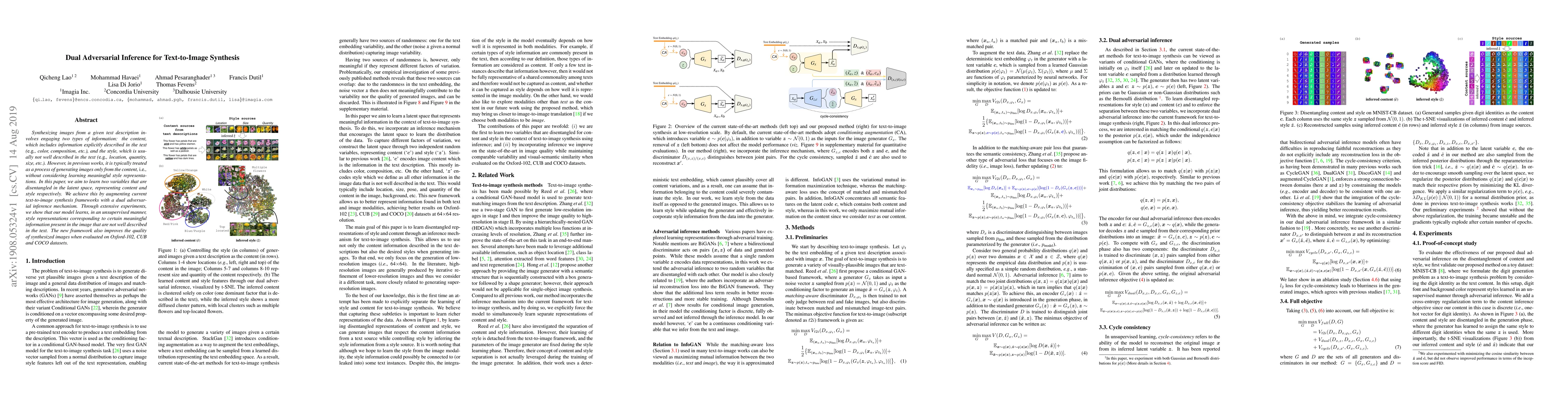 A new framework for text-to-image synthesis uses dual adversarial inference to learn disentangled latent space variables representing content and style, improving image quality on multiple datasets.