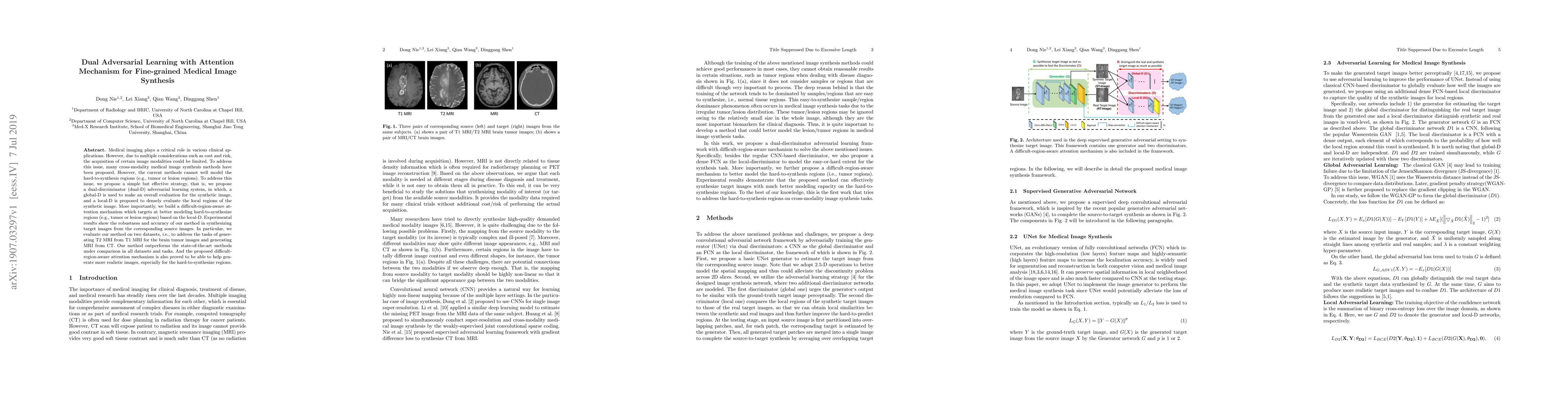 This paper proposes a dual adversarial learning system with an attention mechanism for synthesizing fine-grained medical images, addressing the challenge of modeling hard-to-synthesize regions like tumors. The method uses a global and local discriminator to evaluate synthetic images, with an attention mechanism focusing on difficult regions, achieving superior performance compared to state-of-the-art methods.