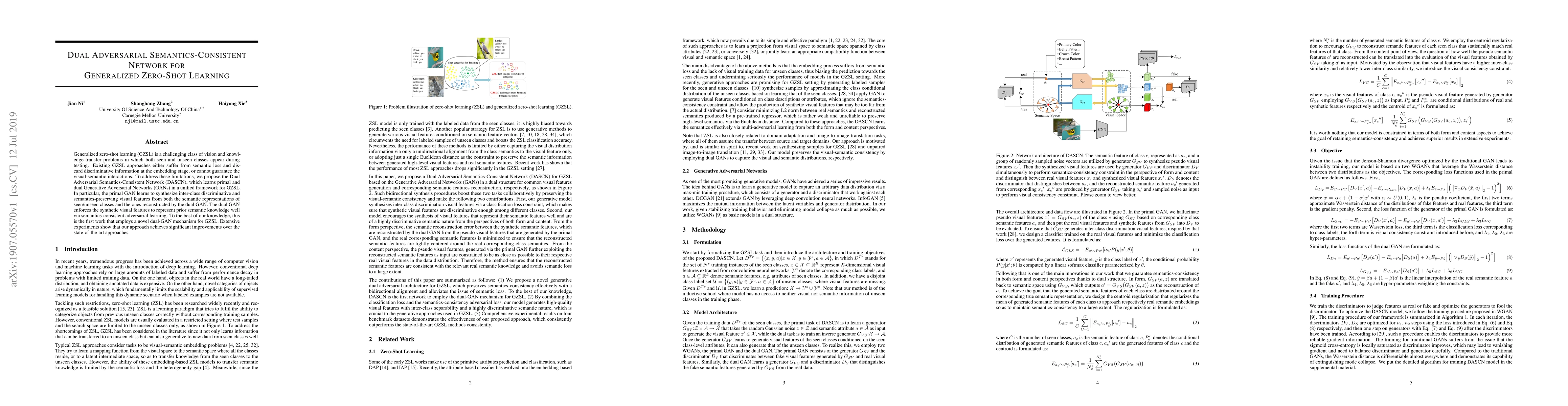 The paper proposes a Dual Adversarial Semantics-Consistent Network (DASCN) for Generalized Zero-Shot Learning, utilizing dual GANs to synthesize discriminative and semantics-preserving visual features, thereby addressing semantic loss and enhancing visual-semantic interactions. The approach achieves significant improvements over existing methods.