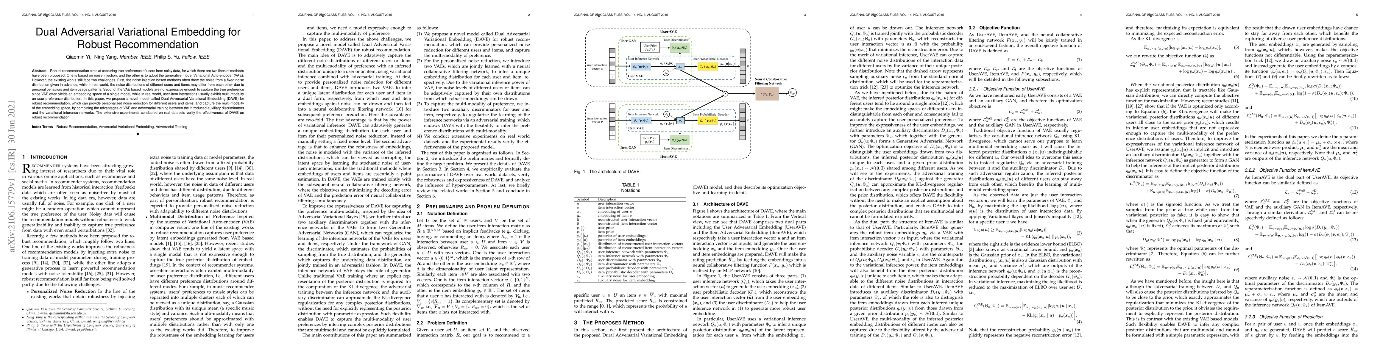 This paper proposes a Dual Adversarial Variational Embedding (DAVE) model to enhance robust recommendation by addressing noise variability and capturing multi-modal user preferences through personalized noise reduction and adversarial training. Experiments show DAVE's effectiveness in real-world datasets.