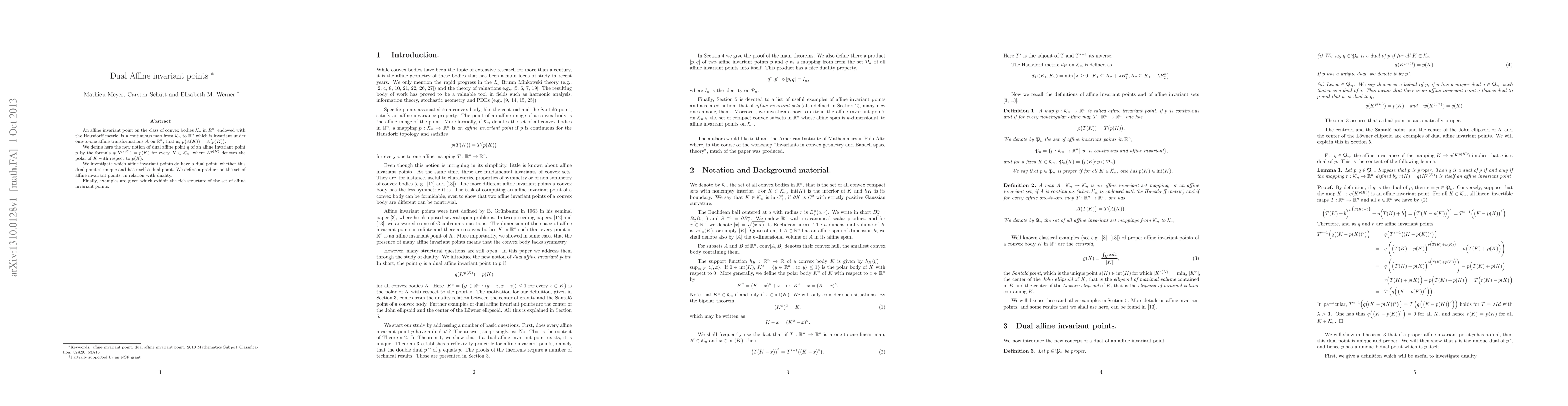 This paper introduces the concept of dual affine invariant points for convex bodies in R^n under the Hausdorff metric, defining a dual point q for a given affine invariant point p. It explores the existence, uniqueness, and properties of these dual points, including a product operation on the set of affine invariant points, and provides examples to illustrate the structure.