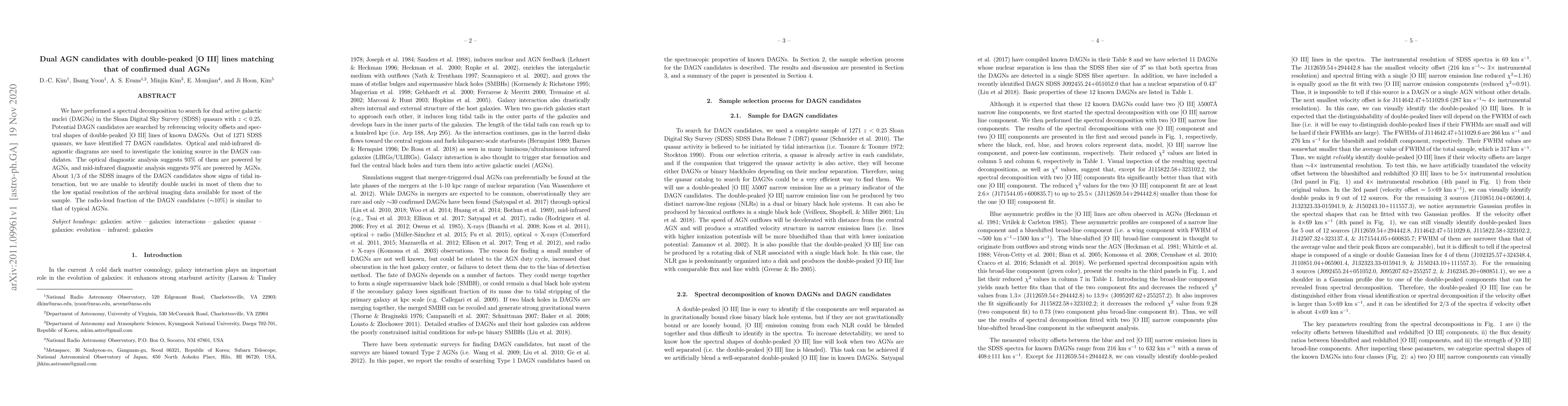 The study identifies 77 dual AGN candidates from 1271 SDSS quasars using double-peaked [O III] lines, confirming 93% and 97% as AGN-powered via optical and mid-infrared diagnostics respectively. Despite signs of tidal interactions in about a third, low-resolution imaging limits double nucleus identification. The radio-loud fraction is comparable to typical AGNs.
