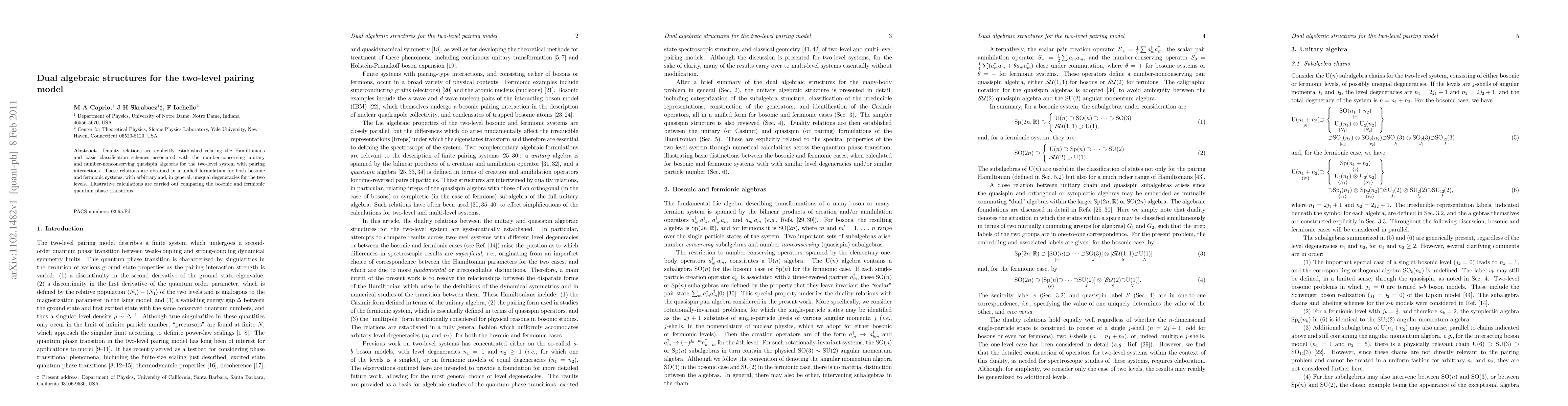 Duality relations are explicitly established relating the Hamiltonians and basis classification schemes associated with the number-conserving unitary and number-nonconserving quasispin algebras for the two-level system with pairing interactions. These relations are obtained in a unified formulation for both bosonic and fermionic systems, with arbitrary and, in general, unequal degeneracies for the two levels. Illustrative calculations are carried out comparing the bosonic and fermionic quantum phase transitions.