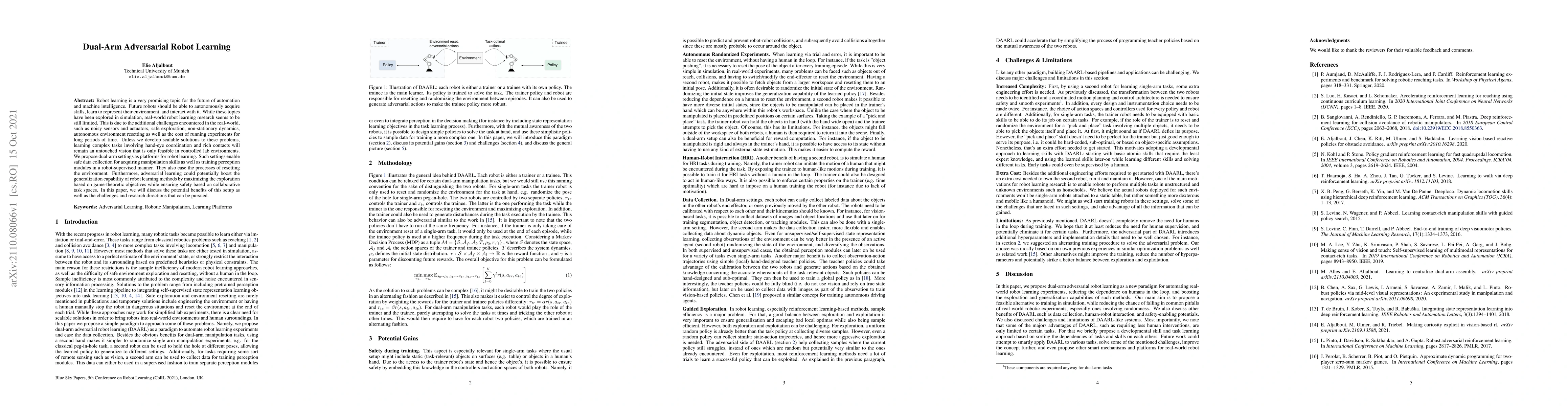 This paper explores the use of dual-arm robots in adversarial learning settings to enhance real-world robot learning, addressing challenges like noisy sensors and safe exploration. It proposes dual-arm configurations to facilitate safe data collection and environment resetting, while adversarial learning aims to improve generalization through game-theoretic exploration.