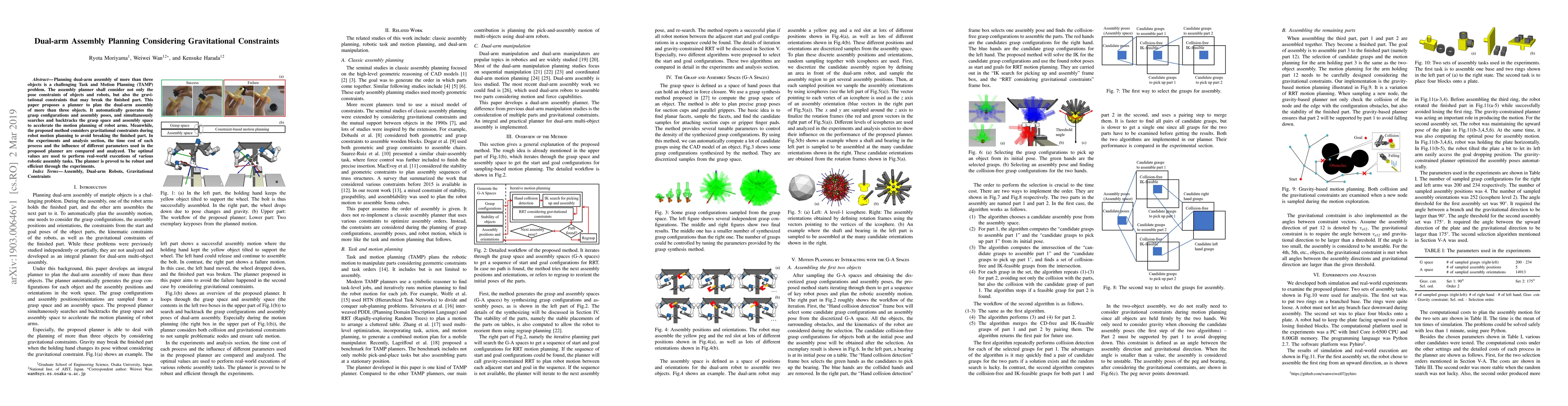 This paper proposes a dual-arm assembly planner that considers gravitational constraints to prevent breaking assembled parts. The planner generates grasp configurations and assembly poses while efficiently searching and backtracking grasp and assembly spaces to optimize robot arm motion planning.