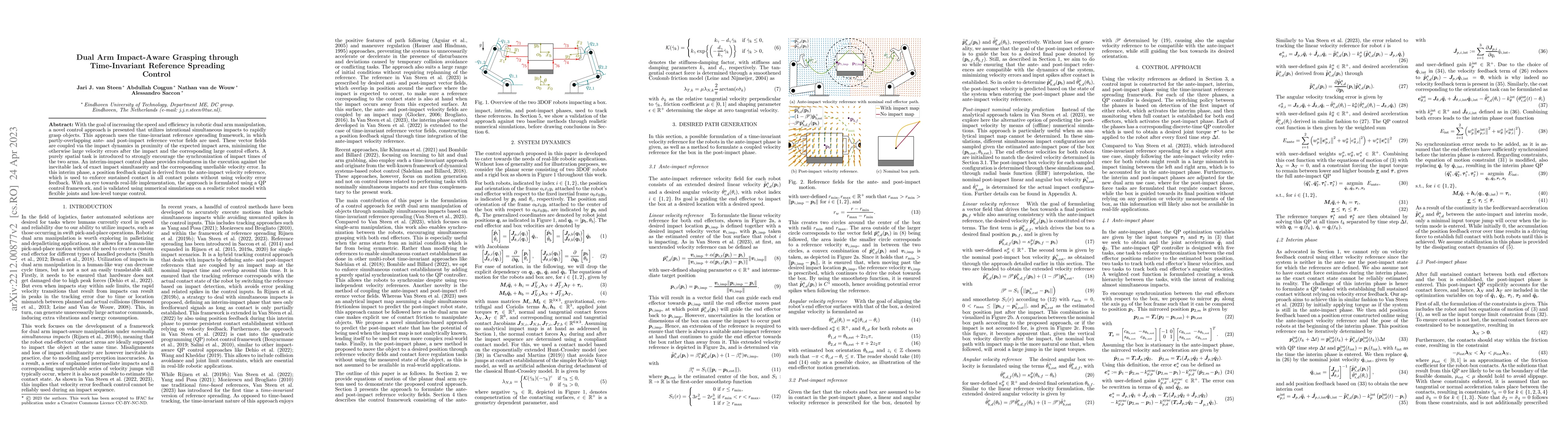 This paper proposes a novel control method for dual-arm robotic manipulation that leverages intentional simultaneous impacts to enhance grasp speed and efficiency. The approach uses time-invariant reference spreading control to minimize post-impact velocity errors and employs an interim-impact control phase to ensure synchronization and robustness against minor timing discrepancies.