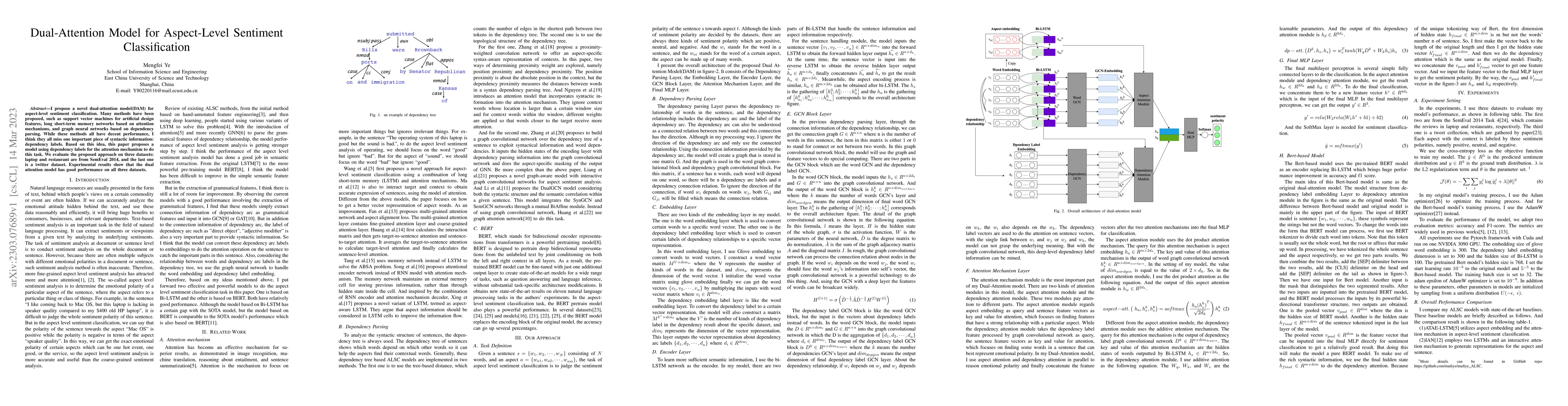 This paper introduces a dual-attention model (DAM) for aspect-level sentiment classification, emphasizing the use of dependency labels in the attention mechanism to enhance performance. The proposed model is evaluated on three datasets, demonstrating improved results compared to existing methods.