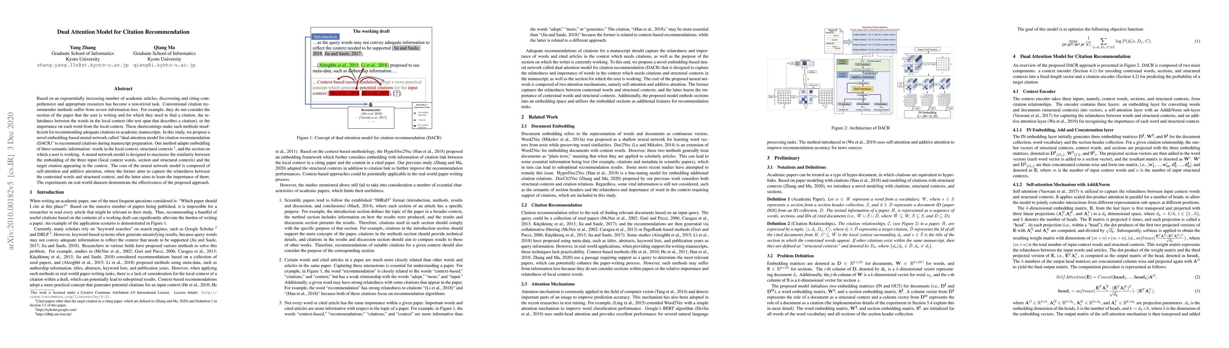 Based on an exponentially increasing number of academic articles, discovering and citing comprehensive and appropriate resources has become a non-trivial task. Conventional citation recommender methods suffer from severe information loss. For example, they do not consider the section of the paper that the user is writing and for which they need to find a citation, the relatedness between the words in the local context (the text span that describes a citation), or the importance on each word from the local context. These shortcomings make such methods insufficient for recommending adequate citations to academic manuscripts. In this study, we propose a novel embedding-based neural network called "dual attention model for citation recommendation (DACR)" to recommend citations during manuscript preparation. Our method adapts embedding of three dimensions of semantic information: words in the local context, structural contexts, and the section on which a user is working. A neural network is designed to maximize the similarity between the embedding of the three input (local context words, section and structural contexts) and the target citation appearing in the context. The core of the neural network is composed of self-attention and additive attention, where the former aims to capture the relatedness between the contextual words and structural context, and the latter aims to learn the importance of them. The experiments on real-world datasets demonstrate the effectiveness of the proposed approach.