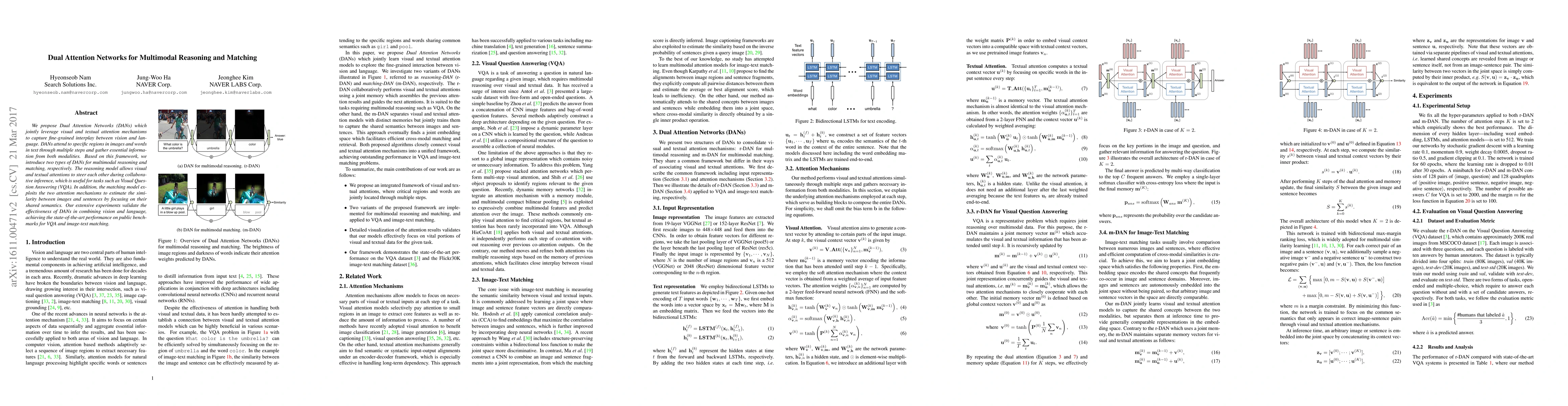We propose Dual Attention Networks (DANs) which jointly leverage visual and textual attention mechanisms to capture fine-grained interplay between vision and language. DANs attend to specific regions in images and words in text through multiple steps and gather essential information from both modalities. Based on this framework, we introduce two types of DANs for multimodal reasoning and matching, respectively. The reasoning model allows visual and textual attentions to steer each other during collaborative inference, which is useful for tasks such as Visual Question Answering (VQA). In addition, the matching model exploits the two attention mechanisms to estimate the similarity between images and sentences by focusing on their shared semantics. Our extensive experiments validate the effectiveness of DANs in combining vision and language, achieving the state-of-the-art performance on public benchmarks for VQA and image-text matching.