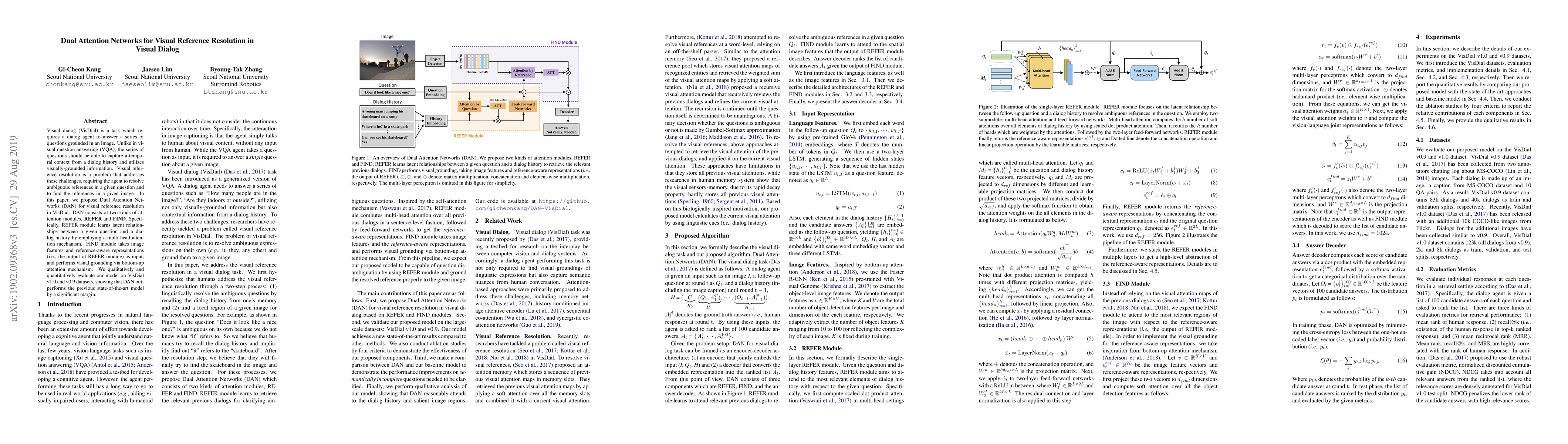 This paper proposes Dual Attention Networks (DAN) for visual reference resolution in visual dialog tasks, featuring REFER and FIND modules to capture dialog context and ground references in images, respectively. DAN outperforms prior models on VisDial datasets, demonstrating improved visual reference resolution.