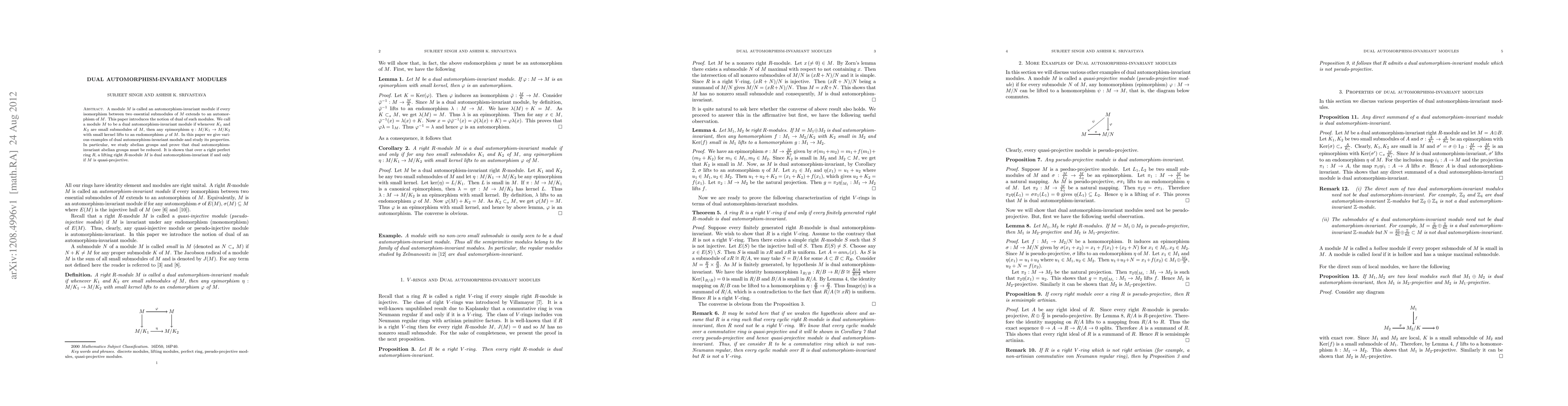 This paper introduces dual automorphism-invariant modules, where any epimorphism between quotients by small submodules lifts to an endomorphism. It provides examples and properties, proving that dual automorphism-invariant abelian groups are reduced and showing that for right perfect rings, such modules are quasi-projective.