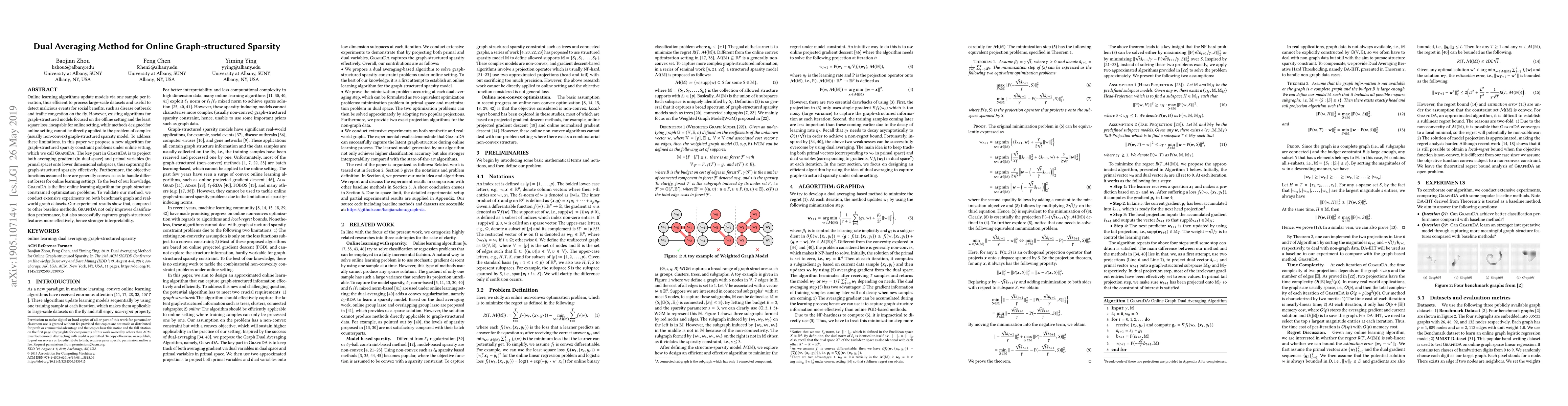 This paper introduces a novel online learning algorithm called \textsc{GraphDA} for graph-structured sparsity problems, effectively projecting both dual and primal variables to lower dimensions to capture graph-structured sparsity. Experimental results demonstrate improved classification performance and better interpretability compared to baseline methods.