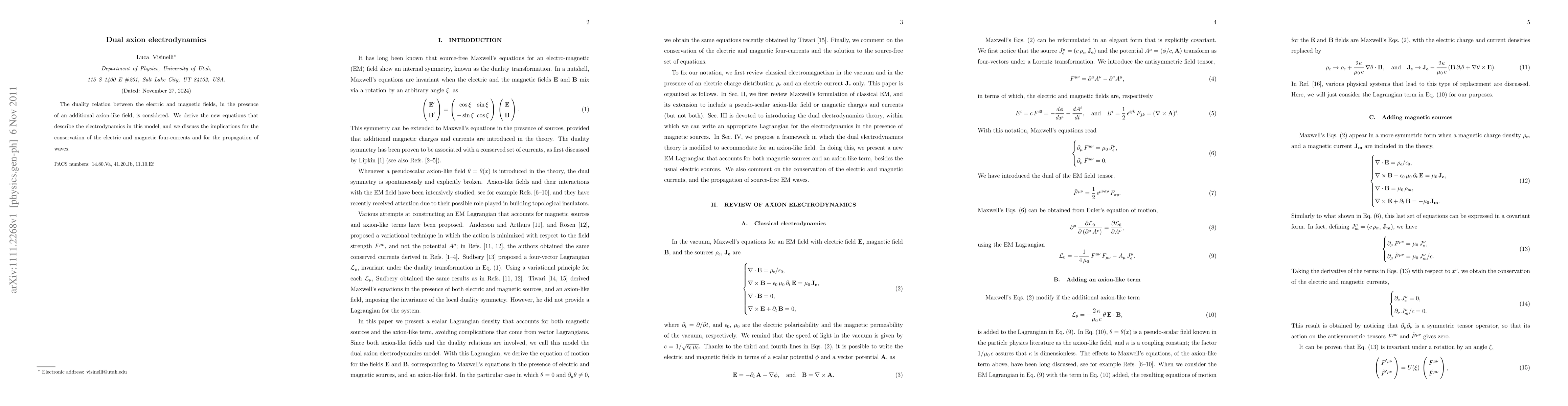 This paper explores the duality between electric and magnetic fields in the presence of an axion-like field, deriving new electrodynamic equations that account for this interaction and discussing its implications for the conservation of electric and magnetic four-currents and wave propagation.