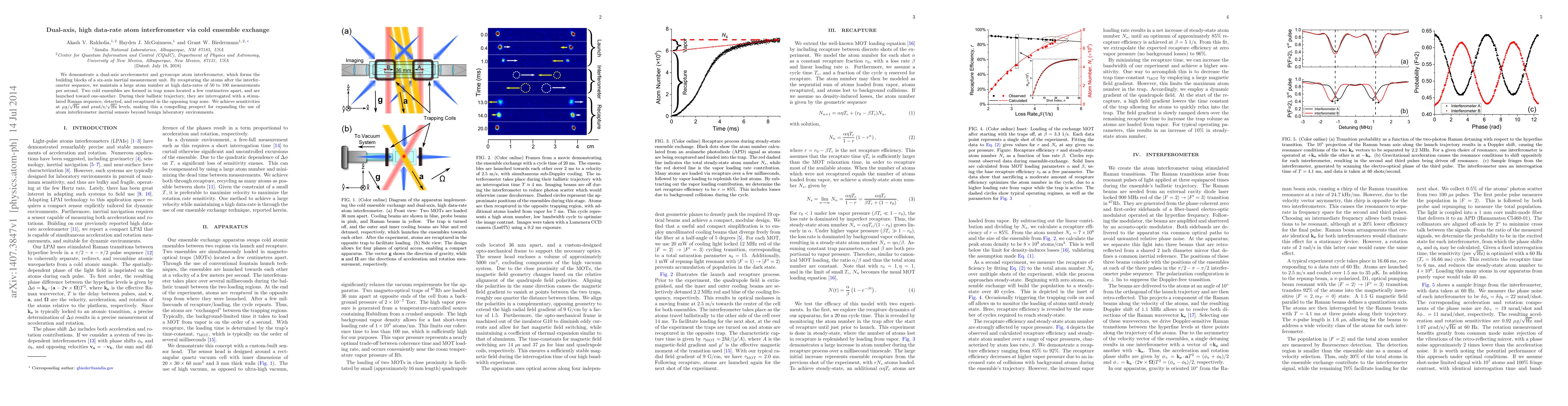 This paper demonstrates a dual-axis atom interferometer using cold ensemble exchange, achieving high data-rate measurements of 50-100 Hz. The setup maintains large atom numbers and achieves sensitivities suitable for inertial measurement units, potentially expanding the use of atom interferometers in non-laboratory settings.