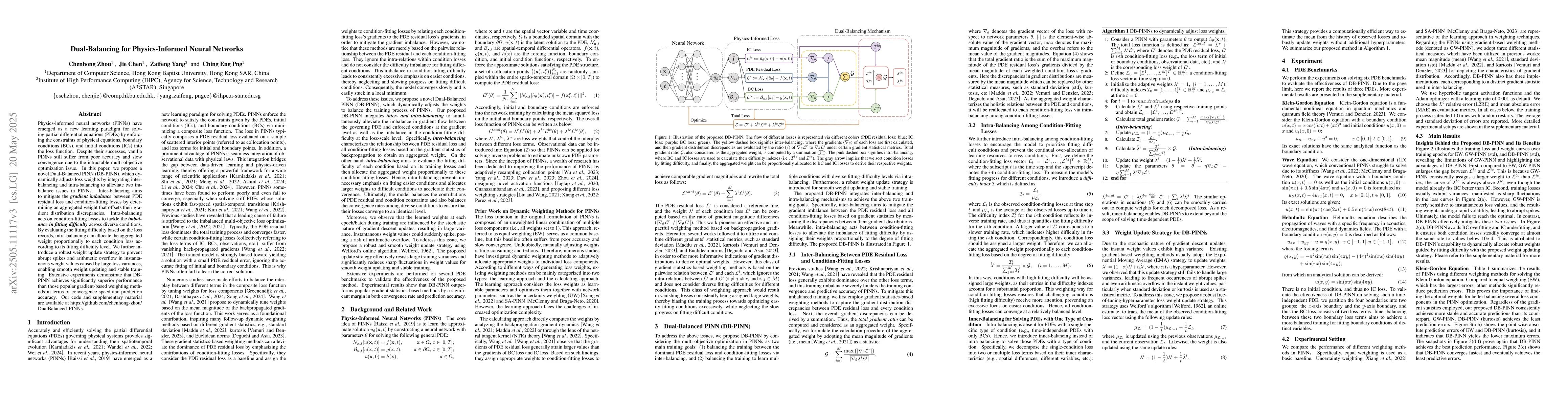 A new method called Dual-Balanced PINN improves physics-informed neural networks by dynamically adjusting weights to balance the optimization of partial differential equations and condition-fitting losses, resulting in faster convergence and better accuracy.