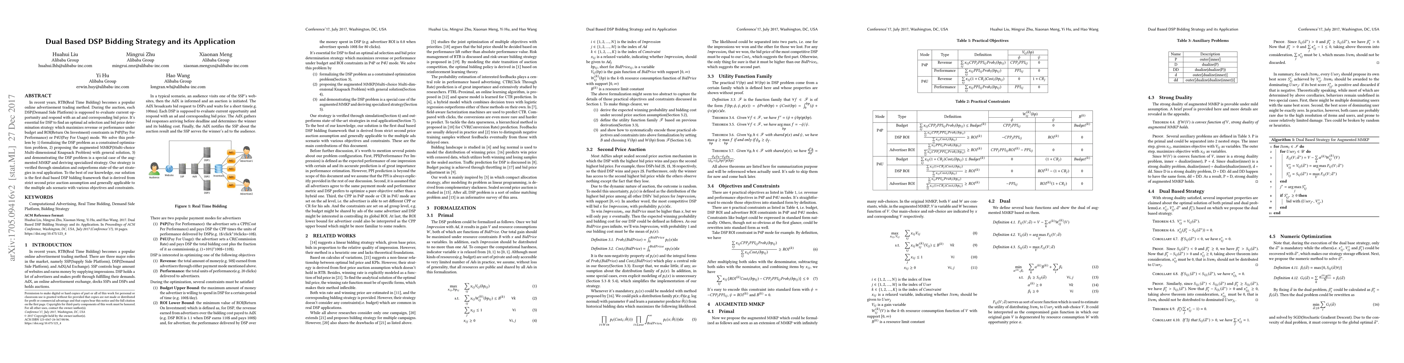 A new DSP bidding strategy is proposed to maximize revenue or performance in online advertising auctions while considering budget and ROI constraints. It outperforms existing strategies through simulation and is a general, dual-based framework for multiple ads scenarios.
