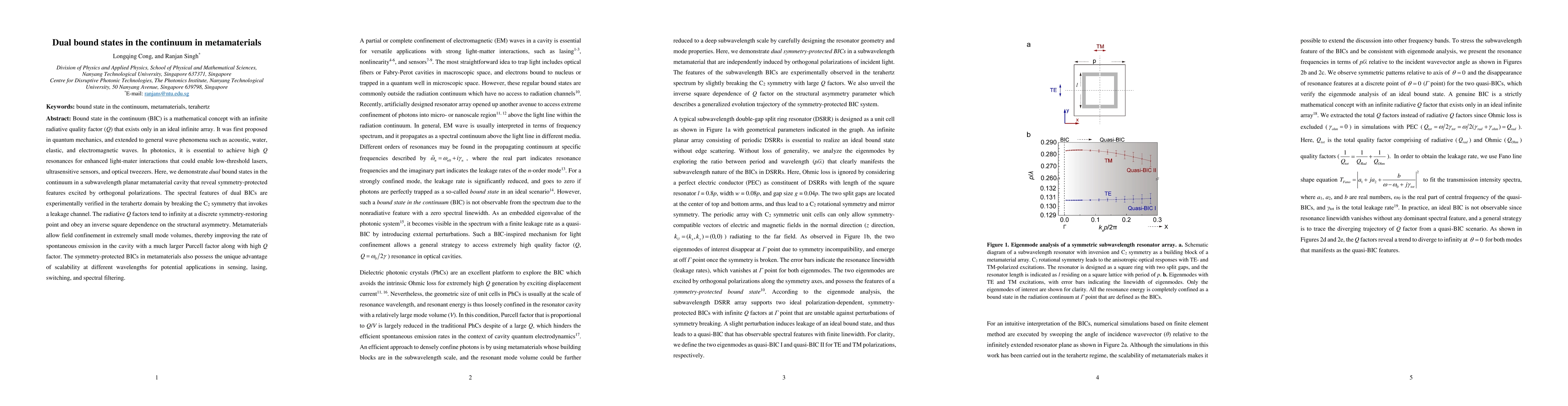 This paper demonstrates dual bound states in the continuum (BIC) in a subwavelength planar metamaterial cavity, revealing symmetry-protected features with infinite radiative quality factors. Experimentally verified in the terahertz domain, the study highlights the scalability and potential applications in sensing, lasing, and filtering.