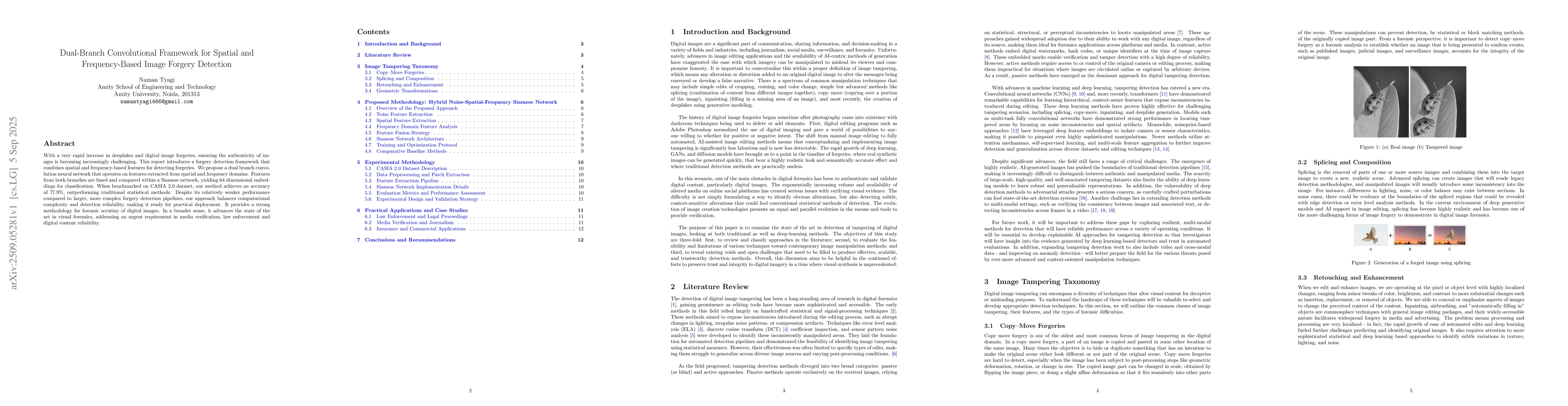 With a very rapid increase in deepfakes and digital image forgeries, ensuring the authenticity of images is becoming increasingly challenging. This report introduces a forgery detection framework that combines spatial and frequency-based features for detecting forgeries. We propose a dual branch convolution neural network that operates on features extracted from spatial and frequency domains. Features from both branches are fused and compared within a Siamese network, yielding 64 dimensional embeddings for classification. When benchmarked on CASIA 2.0 dataset, our method achieves an accuracy of 77.9%, outperforming traditional statistical methods. Despite its relatively weaker performance compared to larger, more complex forgery detection pipelines, our approach balances computational complexity and detection reliability, making it ready for practical deployment. It provides a strong methodology for forensic scrutiny of digital images. In a broader sense, it advances the state of the art in visual forensics, addressing an urgent requirement in media verification, law enforcement and digital content reliability.