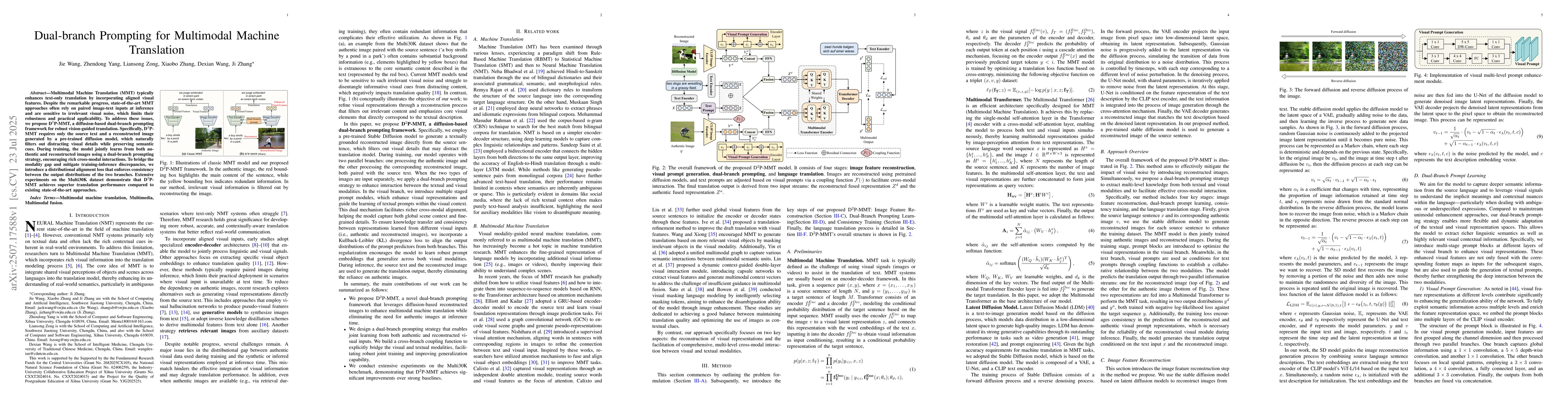 The research proposes D2P-MMT, a diffusion-based dual-branch prompting framework for robust vision-guided translation, which requires only source text and a reconstructed image, filtering out visual noise while preserving semantic cues. It uses a dual-branch prompting strategy for joint learning from authentic and reconstructed images, introducing a distributional alignment loss to enforce consistency between output distributions.