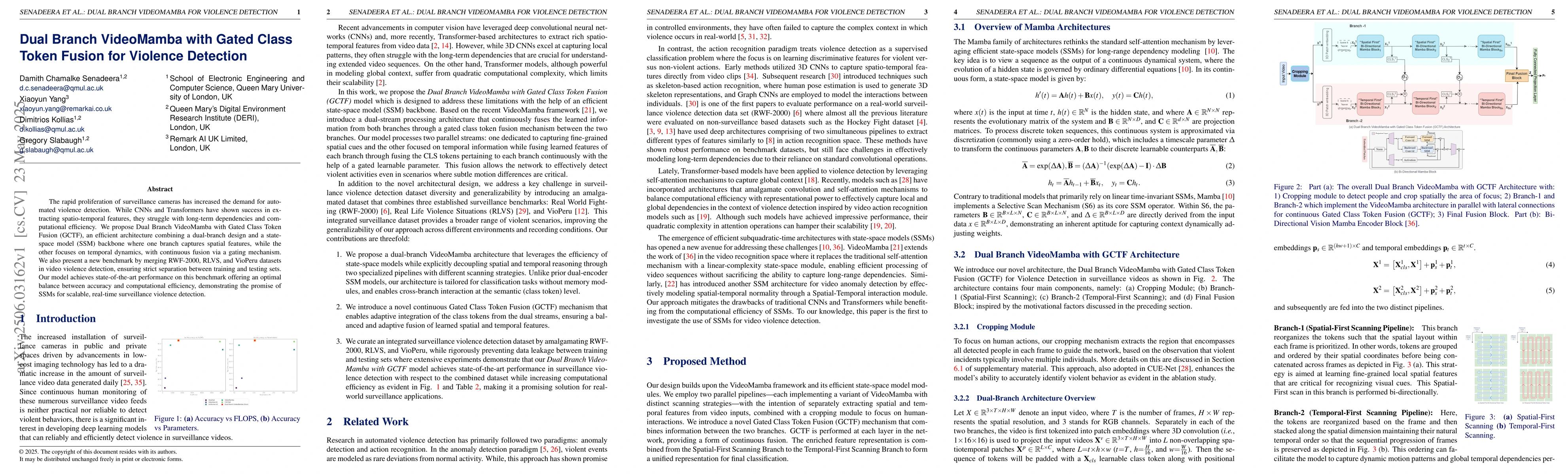 The research introduces Dual Branch VideoMamba with Gated Class Token Fusion (GCTF), an efficient video analysis model for violence detection. This architecture, combining spatial and temporal feature extraction with a gating mechanism, outperforms existing methods on a new benchmark dataset, offering a balance between accuracy and computational efficiency for real-time surveillance applications.