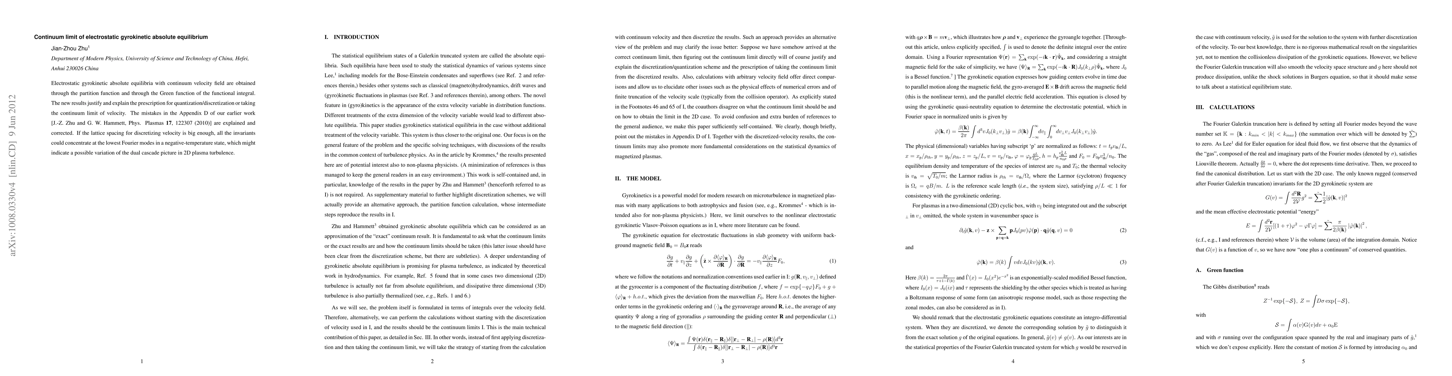 Electrostatic gyrokinetic absolute equilibria with continuum velocity field are obtained through the partition function and through the Green function of the functional integral. The new results justify and explain the prescription for quantization/discretization or taking the continuum limit of velocity. The mistakes in the Appendix D of our earlier work [J.-Z. Zhu and G. W. Hammett, Phys. Plasmas {\bf 17}, 122307 (2010)] are explained and corrected. If the lattice spacing for discretizing velocity is big enough, all the invariants could concentrate at the lowest Fourier modes in a negative-temperature state, which might indicate a possible variation of the dual cascade picture in two-dimension magnetized plasma turbulence.