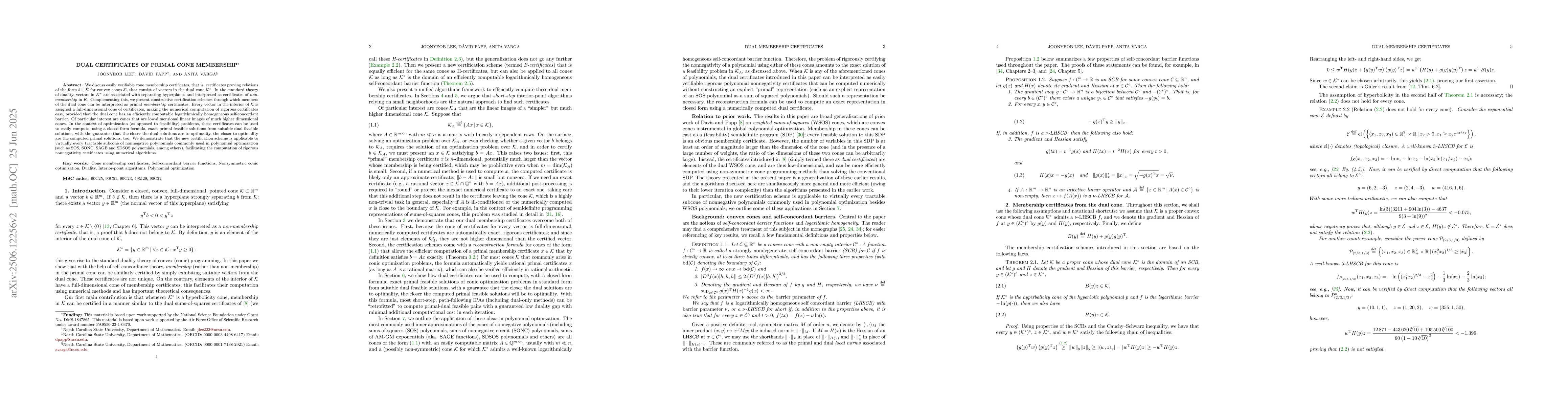 We discuss easily verifiable cone membership certificates, that is, certificates proving relations of the form $b\in K$ for convex cones $K$, that consist of vectors in the dual cone $K^*$. Vectors in the dual cone are usually associated with separating hyperplanes, and so they are interpreted as certificates of non-membership in the standard theory of duality. Complementing this, we present constructive certification schemes through which members of the dual cone can be interpreted as primal membership certificates. Every vector in the interior of $K$ is assigned a full-dimensional cone of certificates, making the numerical computation of rigorous certificates easy, provided that the dual cone has an efficiently computable logarithmically homogeneous self-concordant barrier. Of particular interest are cones that are low-dimensional linear images of much higher dimensional cones. In the context of optimization (as opposed to feasibility) problems, these certificates can be used to easily compute, using a closed-form formula, exact primal feasible solutions from suitable dual feasible solutions, with the guarantee that the closer the dual solutions are to optimality, the closer to optimality are the computed primal solutions, too. We demonstrate that the new certification scheme is applicable to virtually every tractable subcone of nonnegative polynomials commonly used in polynomial optimization (such as SOS, SONC, SAGE and SDSOS polynomials, among others), facilitating the computation of rigorous nonnegativity certificates using numerical algorithms.