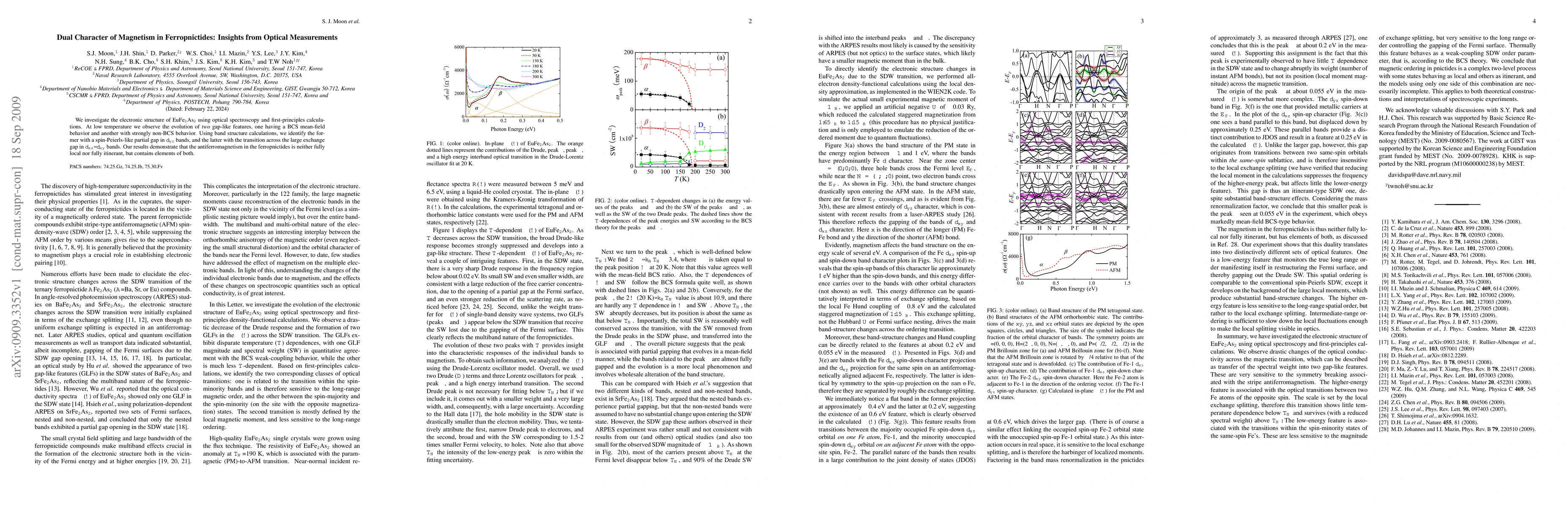 This study reveals dual magnetic character in EuFe$_{2}$As$_{2}$ through optical spectroscopy and calculations, showing two distinct gap-like features: one with BCS behavior linked to a spin-Peierls-like partial gap, and another with non-BCS behavior associated with a large exchange gap. The findings suggest that antiferromagnetism in ferropnictides exhibits both local and itinerant magnetic characteristics.