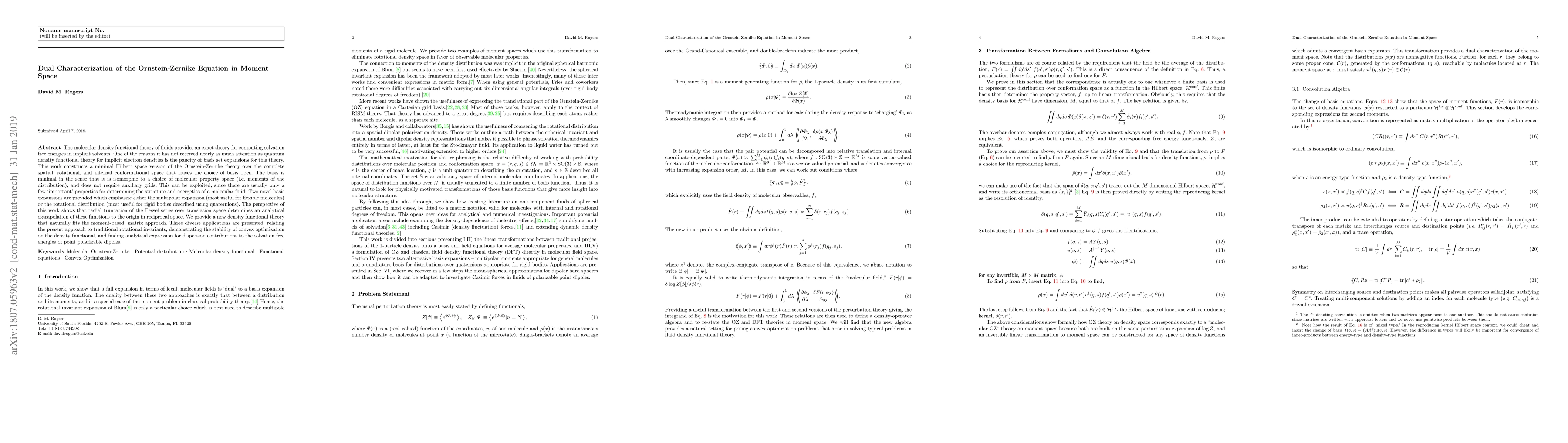 The molecular density functional theory of fluids provides an exact theory for computing solvation free energies in implicit solvents. One of the reasons it has not received nearly as much attention as quantum density functional theory for implicit electron densities is the paucity of basis set expansions for this theory. This work constructs a minimal Hilbert space version of the Ornstein-Zernike theory over the complete spatial, rotational, and internal conformational space that leaves the choice of basis open. The basis is minimal in the sense that it is isomorphic to a choice of molecular property space (i.e. moments of the distribution), and does not require auxiliary grids. This can be exploited, since there are usually only a few `important' properties for determining the structure and energetics of a molecular fluid. Two novel basis expansions are provided which emphasize either the multipolar expansion (most useful for flexible molecules) or the rotational distribution (most useful for rigid bodies described using quaternions). The perspective of this work shows that radial truncation of the Bessel series over translation space determines an analytical extrapolation of these functions to the origin in reciprocal space. We provide a new density functional theory that naturally fits the moment-based, matrix approach. Three diverse applications are presented: relating the present approach to traditional rotational invariants, demonstrating the stability of convex optimization on the density functional, and finding analytical expression for dispersion contributions to the solvation free energies of point polarizable dipoles.