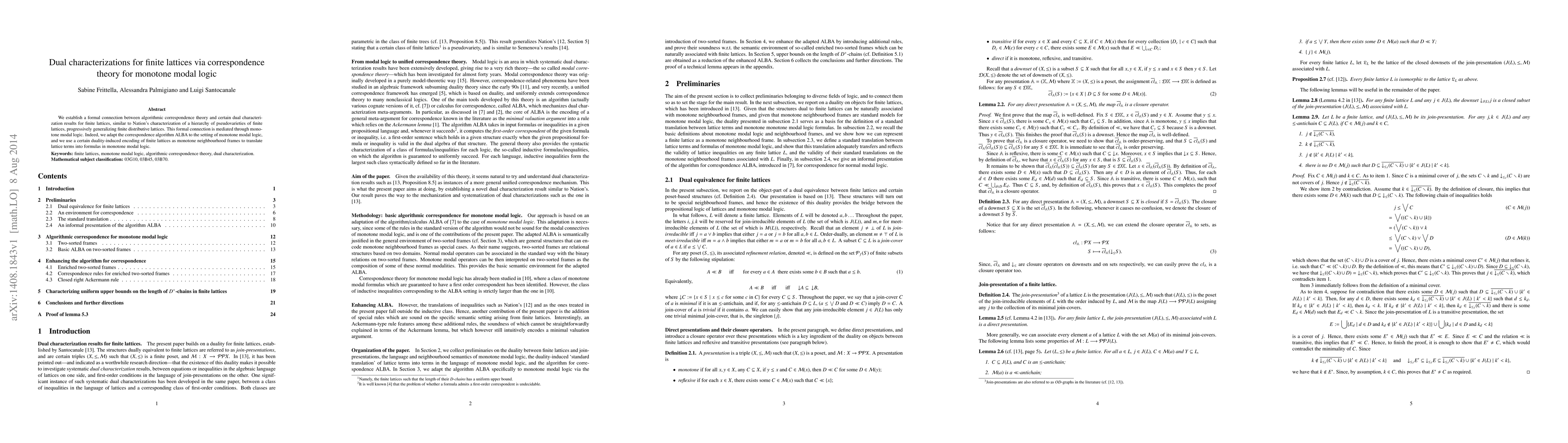 Summary: The paper establishes a link between algorithmic correspondence theory and dual characterizations of finite lattices using monotone modal logic, adapting the ALBA algorithm and translating lattice terms into logic formulas via a duality-induced encoding. This generalizes Nation's hierarchy of pseudovarieties for finite distributive lattices.