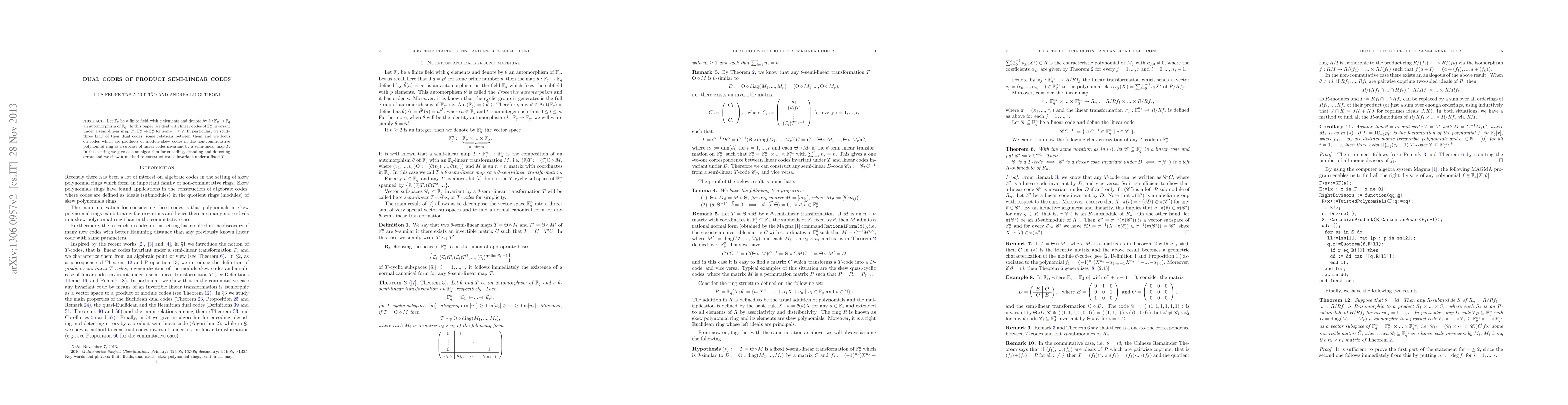 Let $\mathbb{F}_q$ be a finite field with $q$ elements and denote by $\theta : \mathbb{F}_q\to\mathbb{F}_q$ an automorphism of $\mathbb{F}_q$. In this paper, we deal with linear codes of $\mathbb{F}_q^n$ invariant under a semi-linear map $T:\mathbb{F}_q^n\to\mathbb{F}_q^n$ for some $n\geq 2$. In particular, we study three kind of their dual codes, some relations between them and we focus on codes which are products of module skew codes in the non-commutative polynomial ring $\mathbb{F}_q[X,\theta]$ as a subcase of linear codes invariant by a semi-linear map $T$. In this setting we give also an algorithm for encoding, decoding and detecting errors and we show a method to construct codes invariant under a fixed $T$.