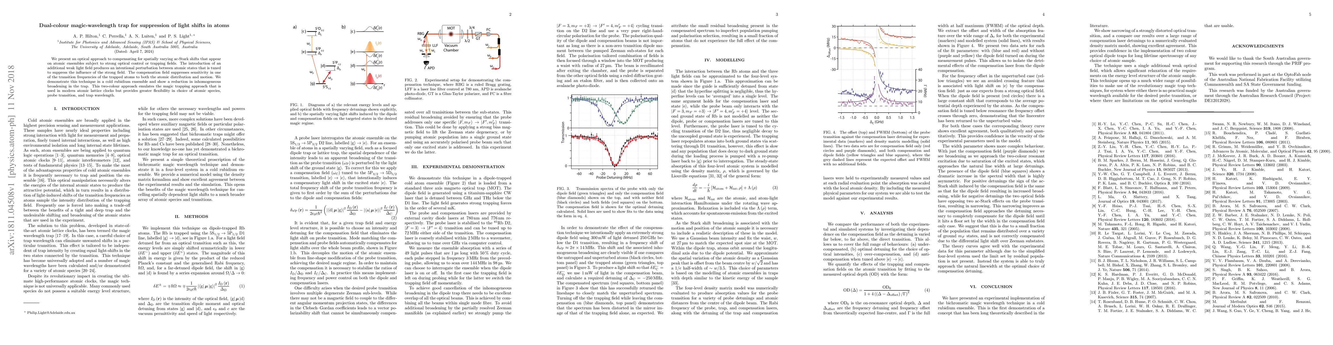 This paper introduces a dual-colour magic-wavelength trap technique to suppress light shifts in atoms, demonstrating its effectiveness in reducing inhomogeneous broadening in a cold rubidium ensemble. The method provides greater flexibility compared to traditional magic trapping, applicable to various atomic species and transitions.