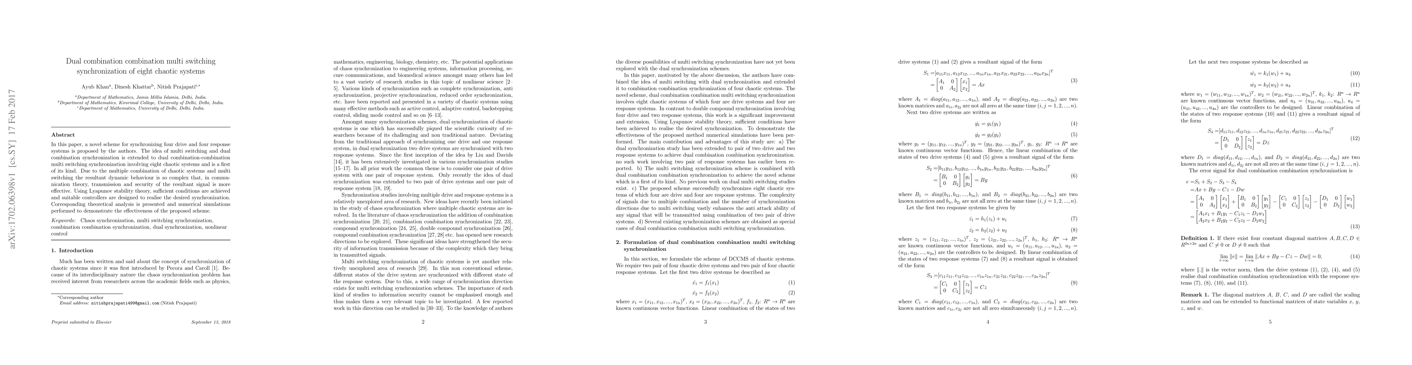 This paper proposes a novel dual combination-combination multi switching synchronization scheme for eight chaotic systems, extending the idea of multi switching and dual combination synchronization. The method enhances communication security through complex dynamic behavior, with theoretical analysis and numerical simulations validating its effectiveness.