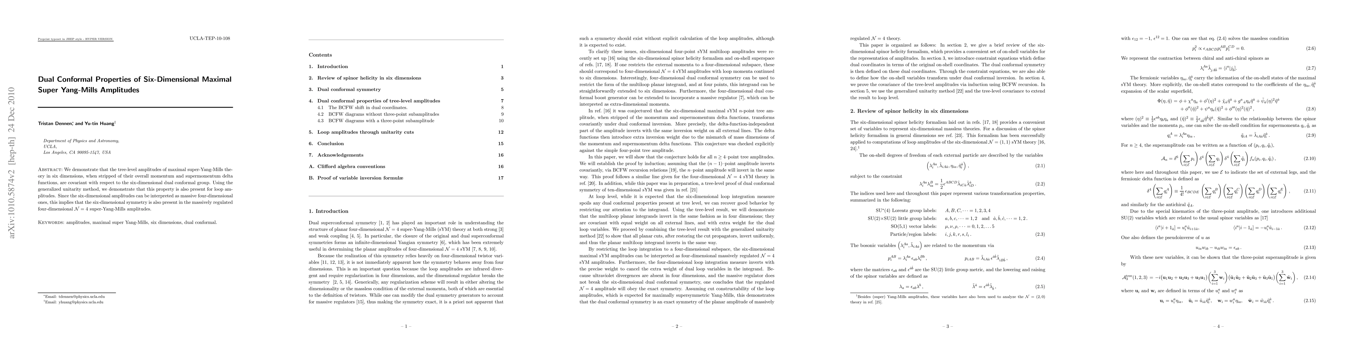 This paper shows that six-dimensional maximal super Yang-Mills tree-level amplitudes exhibit dual conformal symmetry, a property extended to loop amplitudes via the generalized unitarity method. The findings suggest that this symmetry is preserved in massively regulated four-dimensional amplitudes.