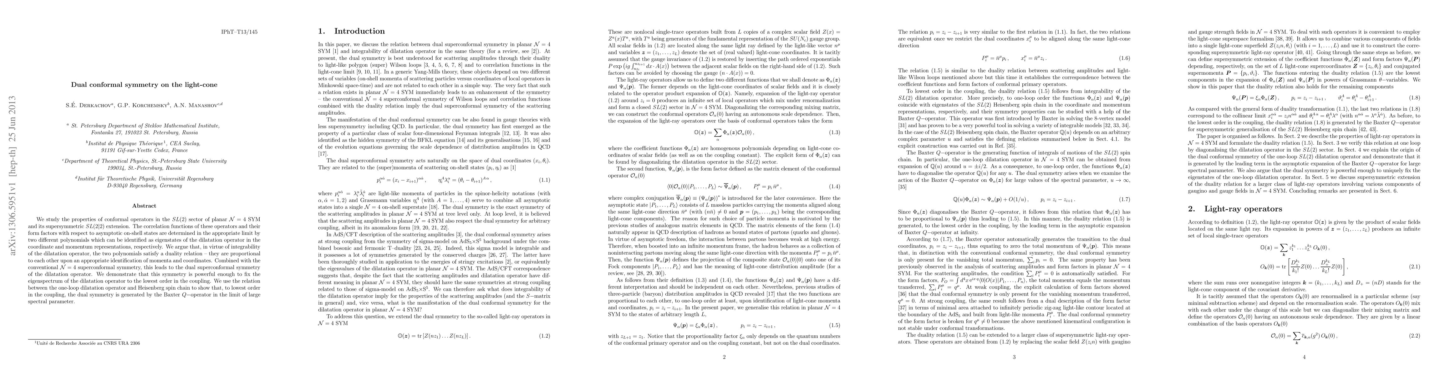 We study the properties of conformal operators in the SL(2) sector of planar N=4 SYM and its supersymmetric SL(2|2) extension. The correlation functions of these operators and their form factors with respect to asymptotic on-shell states are determined in the appropriate limit by two different polynomials which can be identified as eigenstates of the dilatation operator in the coordinate and momentum representations, respectively. We argue that, in virtue of integrability of the dilatation operator, the two polynomials satisfy a duality relation -- they are proportional to each other upon an appropriate identification of momenta and coordinates. Combined with the conventional N=4 superconformal symmetry, this leads to the dual superconformal symmetry of the dilatation operator. We demonstrate that this symmetry is powerful enough to fix the eigenspectrum of the dilatation operator to the lowest order in the coupling. We use the relation between the one-loop dilatation operator and Heisenberg spin chain to show that, to lowest order in the coupling, the dual symmetry is generated by the Baxter Q-operator in the limit of large spectral parameter.