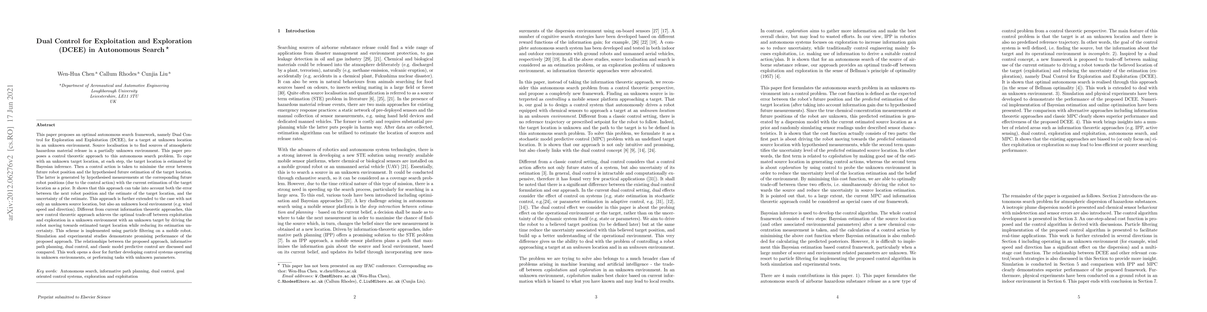 The Dual Control for Exploration and Exploitation (DCEE) framework proposes an optimal autonomous search approach for locating unknown sources in partially unknown environments, balancing exploration and exploitation to minimize error and uncertainty.