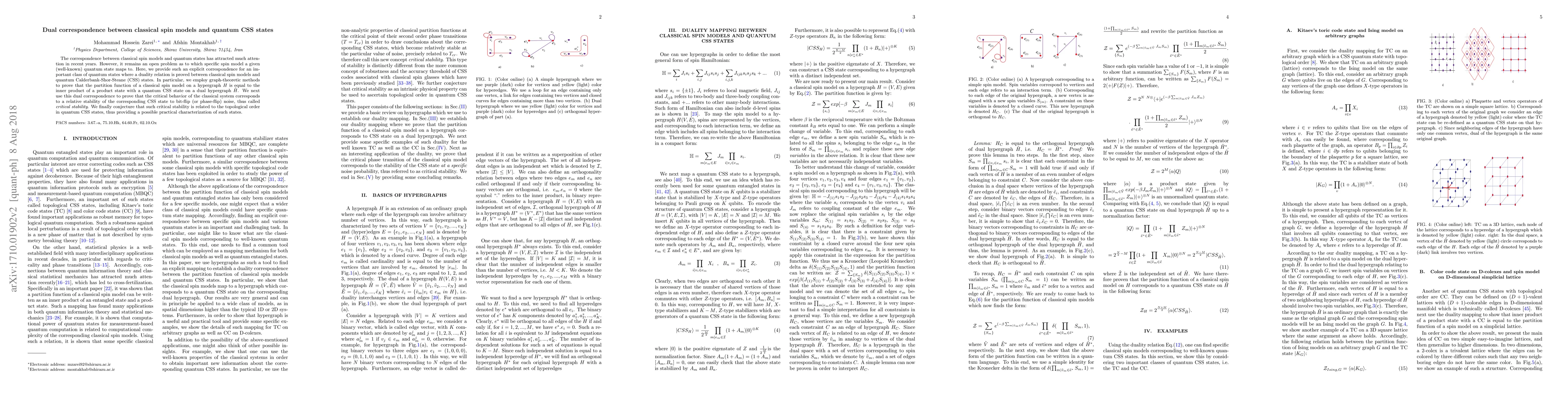 This paper establishes a duality between classical spin models on hypergraphs and quantum CSS states on their dual hypergraphs, demonstrating that the partition function of the classical model equals the inner product of the CSS state. It also shows that critical behavior in the classical system correlates with the CSS state's stability against noise, suggesting a link to topological order in quantum CSS states.
