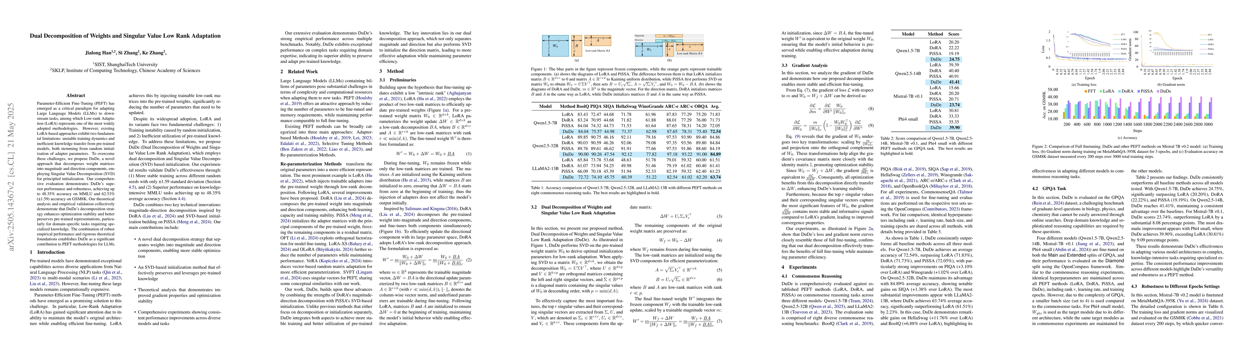 DuDe proposes a novel approach to Low-rank Adaptation for Large Language Models, using Singular Value Decomposition to improve optimization stability and knowledge transfer, achieving up to 48.35% accuracy on MMLU.
