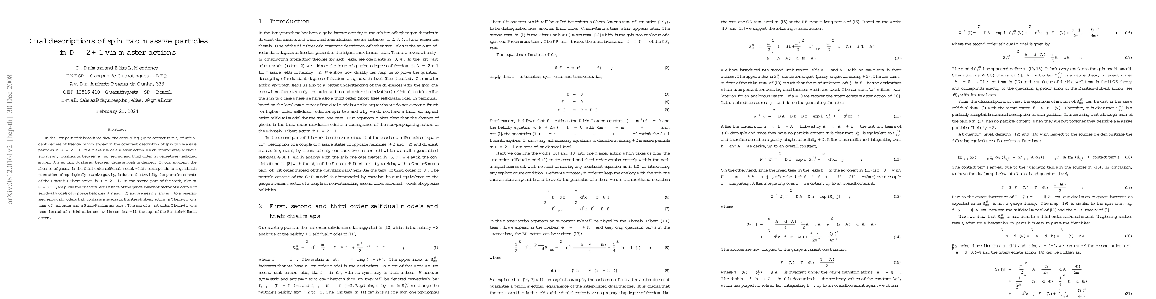 This paper demonstrates the decoupling of redundant degrees of freedom in the covariant description of spin two massive particles in 2+1 dimensions using a master action. It also proves the quantum equivalence between gauge invariant sectors of self-dual models of opposite helicities and a generalized self-dual model incorporating a quadratic Einstein-Hilbert action, a first-order Chern-Simons term, and a Fierz-Pauli mass term.
