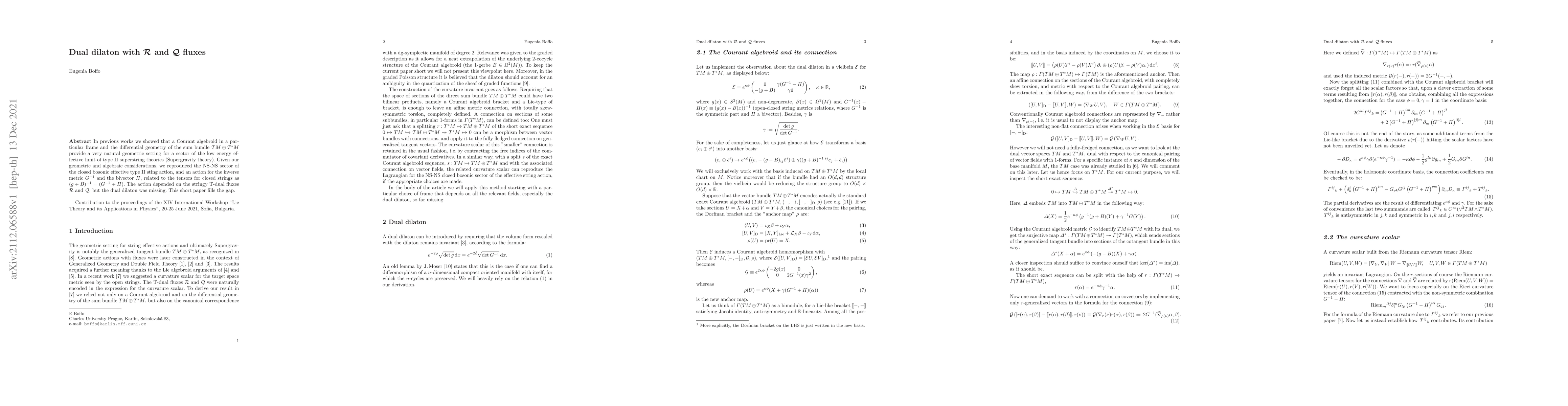 In previous works we showed that a Courant algebroid in a particular frame and the differential geometry of the sum bundle $TM \oplus T^*M$ provide a very natural geometric setting for a sector of the low energy effective limit of type II superstring theories (Supergravity theory). Given our geometric and algebraic considerations, we reproduced the NS-NS sector of the closed bosonic effective type II sting action, and an action for the inverse metric $G^{-1}$ and the bivector $\Pi$, related to the tensors for closed strings as $(g+B)^{-1} = (G^{-1} +\Pi)$. The action depended on the stringy T-dual fluxes $\mathcal{R}$ and $\mathcal{Q}$, but the dual dilaton was missing. This short paper fills the gap.
