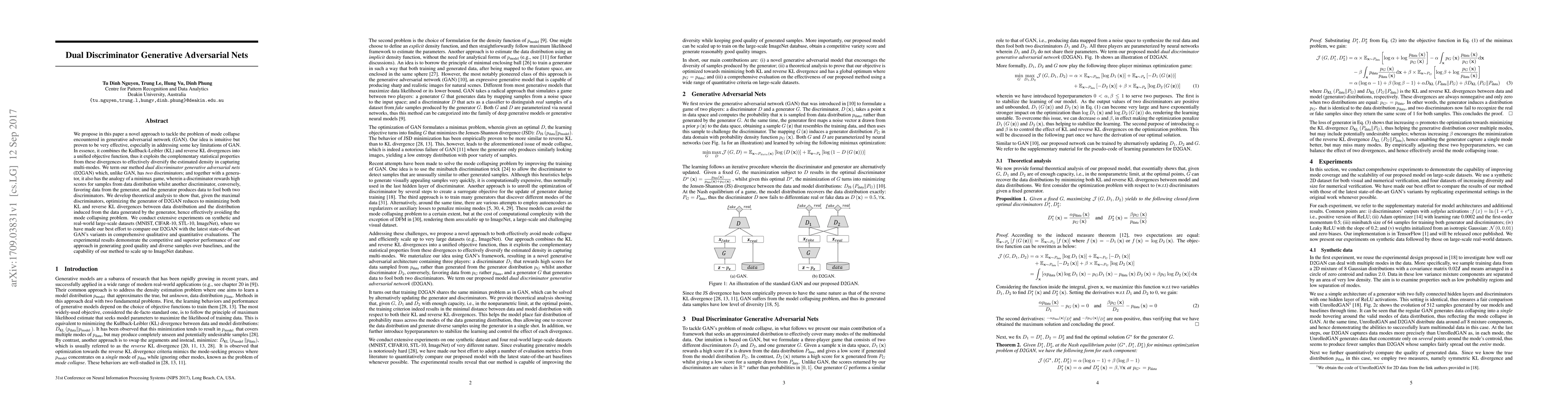 This paper introduces D2GAN, a novel GAN variant that addresses mode collapse by combining Kullback-Leibler and reverse KL divergences into a unified objective function. It employs two discriminators to enhance diversity and avoid mode collapse, demonstrating superior performance in generating high-quality and diverse samples across various datasets.