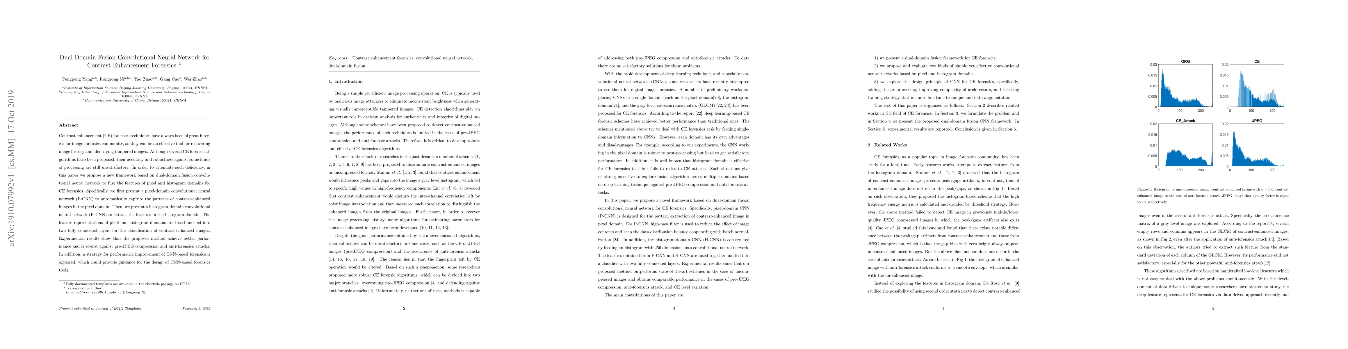 This research introduces a dual-domain fusion convolutional neural network for contrast enhancement forensics, aiming to improve the accuracy and robustness of detecting tampered images. The proposed framework combines pixel-domain and histogram-domain convolutional neural networks to extract and fuse features, leading to enhanced performance against pre-JPEG compression and anti-forensics attacks.