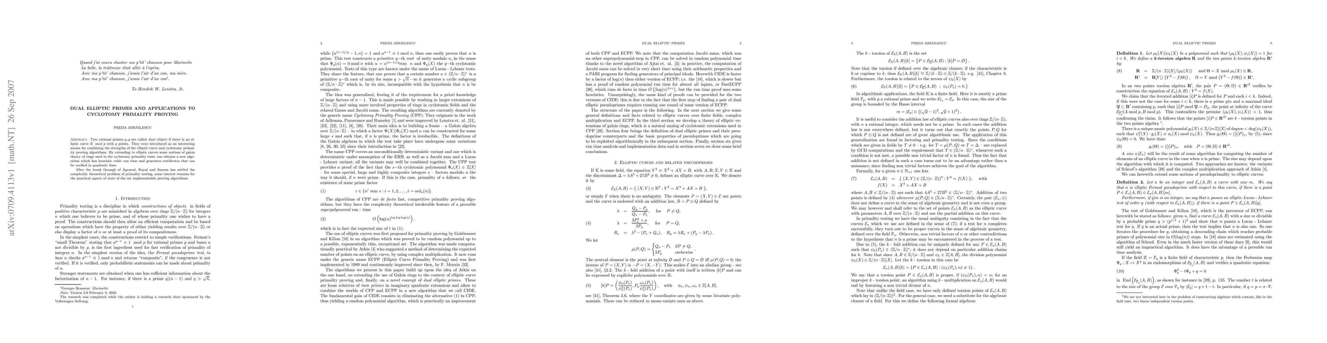 Two rational primes p, q are called dual elliptic if there is an elliptic curve E mod p with q points. They were introduced as an interesting means for combining the strengths of the elliptic curve and cyclotomy primality proving algorithms. By extending to elliptic curves some notions of galois theory of rings used in the cyclotomy primality tests, one obtains a new algorithm which has heuristic cubic run time and generates certificates that can be verified in quadratic time. After the break through of Agrawal, Kayal and Saxena has settled the complexity theoretical problem of primality testing, some interest remains for the practical aspect of state of the art implementable proving algorithms.