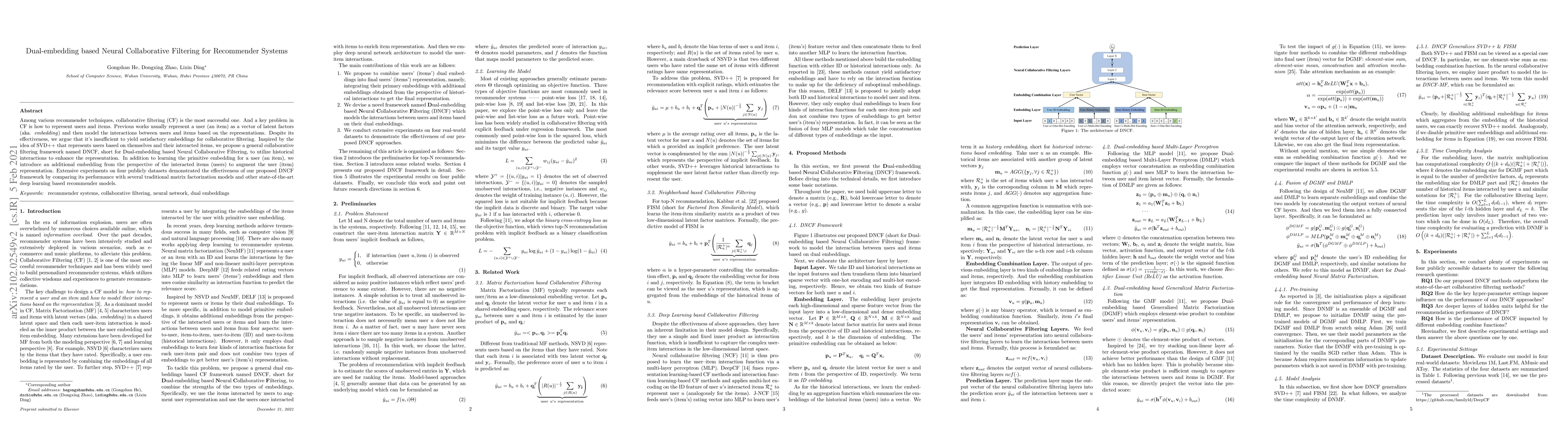 The paper proposes DNCF, a Dual-embedding based Neural Collaborative Filtering framework, to enhance user and item representations in recommender systems by incorporating both self-embedding and interaction-based embeddings. Experimental results show that DNCF outperforms traditional matrix factorization and other deep learning recommender models.