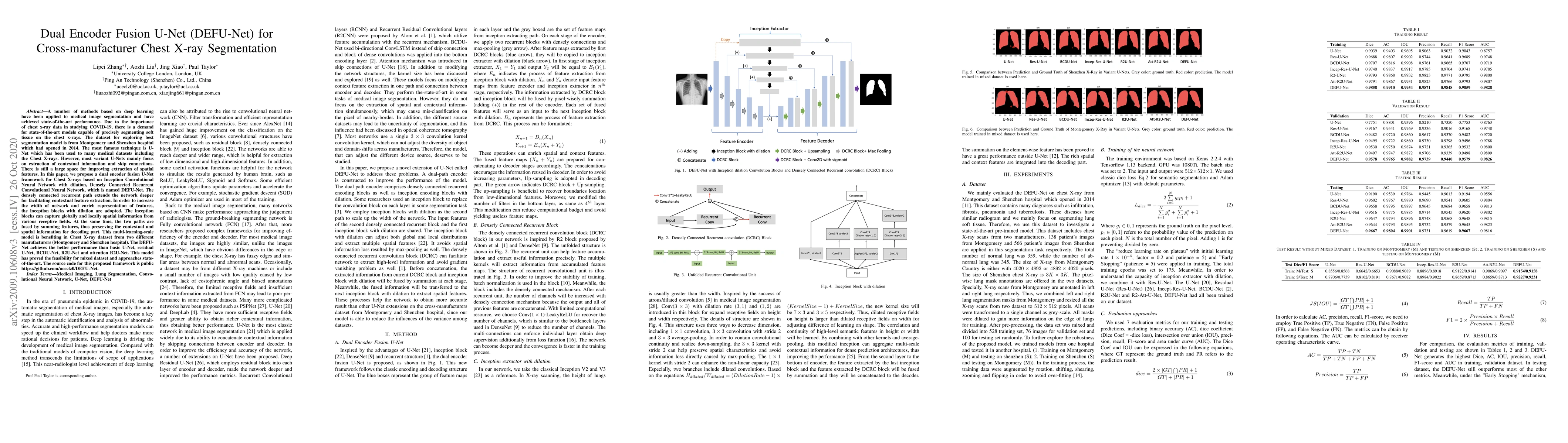 The paper proposes DEFU-Net, a dual encoder fusion U-Net framework for chest X-ray segmentation, combining Inception blocks with dilation and Densely Connected Recurrent Convolutional Neural Networks to enhance spatial and contextual feature extraction. The model achieves superior performance on chest X-rays from two different manufacturers, demonstrating state-of-the-art results.