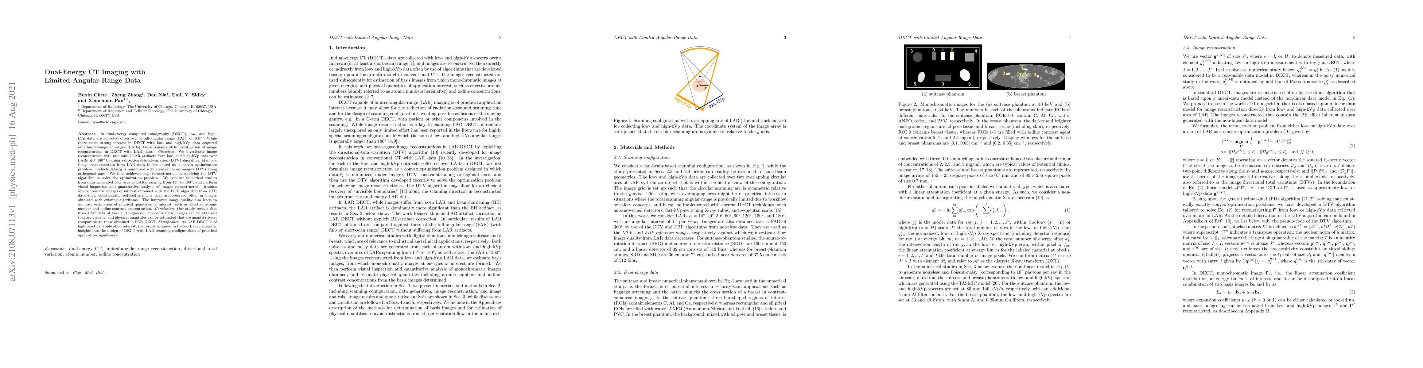 This paper investigates the reconstruction of dual-energy CT (DECT) images using limited-angular-range (LAR) data, employing a directional-total-variation (DTV) algorithm to minimize artifacts. The results show significantly reduced artifacts and accurate estimation of physical quantities compared to full-angular-range DECT.