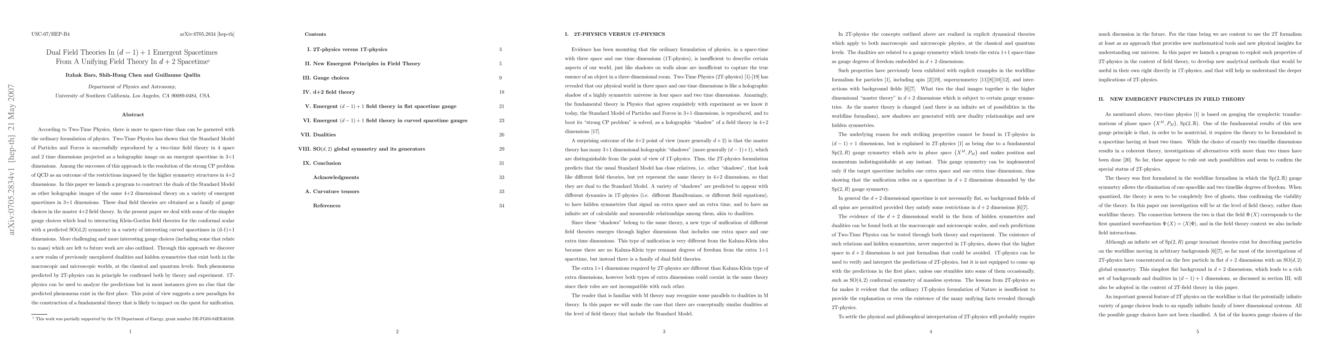 This paper explores dual field theories in emergent (d-1)+1 spacetimes derived from a unifying 4+2 dimensional field theory, proposing new dualities and symmetries in both classical and quantum realms. It highlights the potential of Two-Time Physics to resolve longstanding problems like the strong CP issue and suggests a novel paradigm for unification theory.