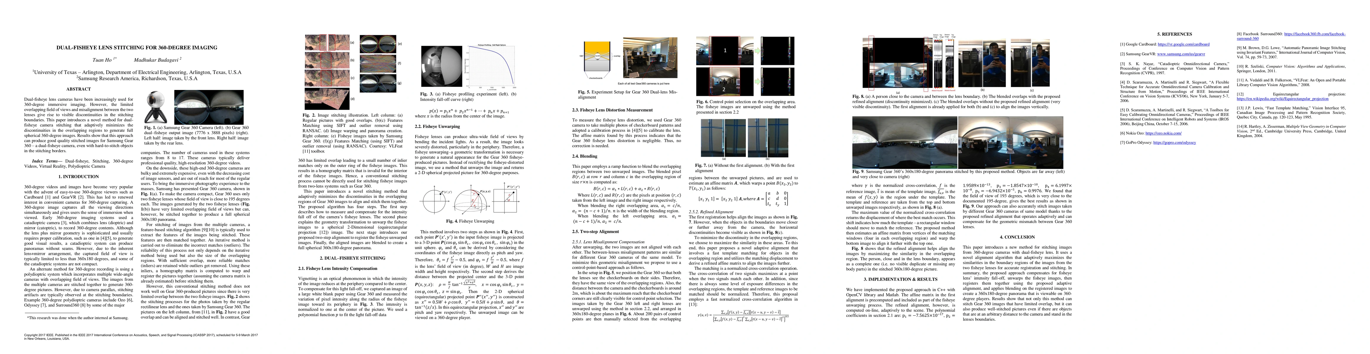 This paper presents a novel method for stitching dual-fisheye lens cameras to create seamless 360-degree images, addressing visible discontinuities by adaptively minimizing overlap misalignments. The proposed technique effectively generates high-quality spherical images, even with challenging objects at the stitching boundaries.