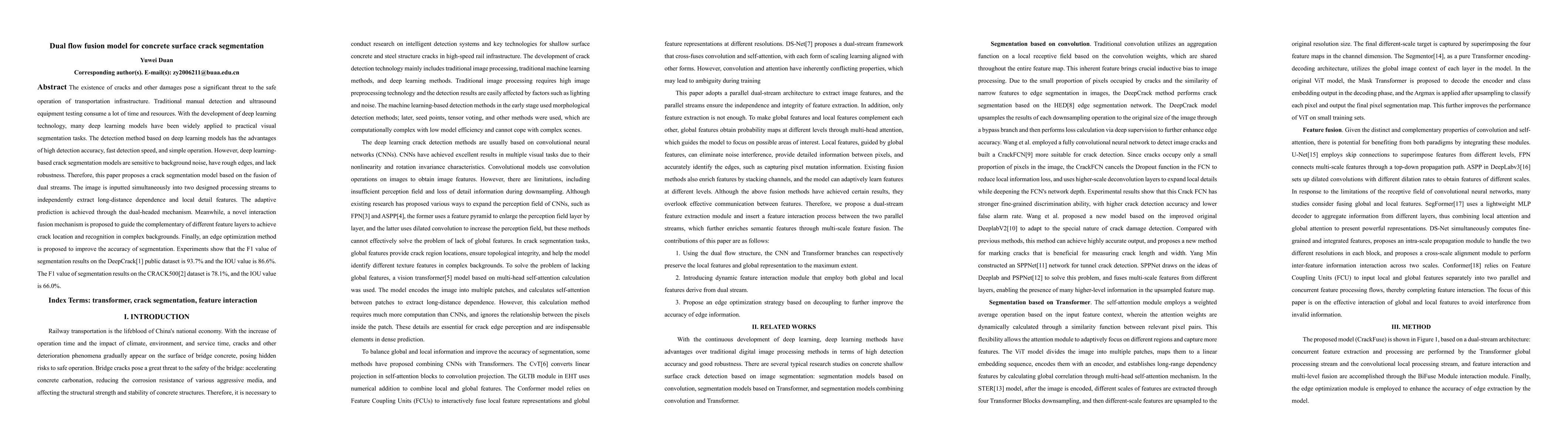 This paper proposes a dual flow fusion model for concrete surface crack segmentation using deep learning to improve detection accuracy and speed. The model employs dual streams for extracting long-distance and local features, enhancing robustness and edge precision, achieving high F1 and IOU scores on public datasets.