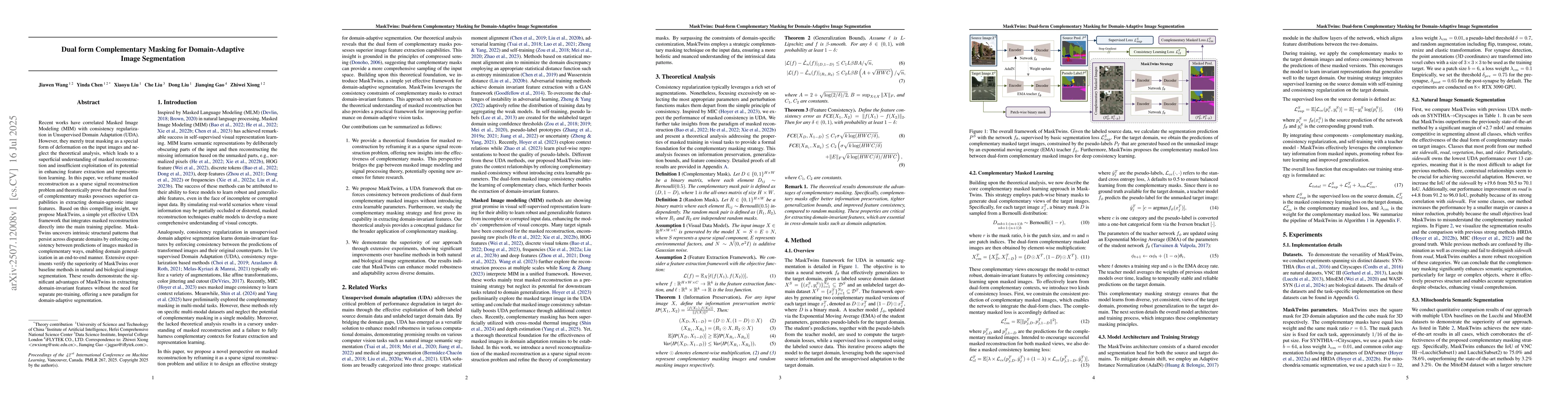 Recent works have correlated Masked Image Modeling (MIM) with consistency regularization in Unsupervised Domain Adaptation (UDA). However, they merely treat masking as a special form of deformation on the input images and neglect the theoretical analysis, which leads to a superficial understanding of masked reconstruction and insufficient exploitation of its potential in enhancing feature extraction and representation learning. In this paper, we reframe masked reconstruction as a sparse signal reconstruction problem and theoretically prove that the dual form of complementary masks possesses superior capabilities in extracting domain-agnostic image features. Based on this compelling insight, we propose MaskTwins, a simple yet effective UDA framework that integrates masked reconstruction directly into the main training pipeline. MaskTwins uncovers intrinsic structural patterns that persist across disparate domains by enforcing consistency between predictions of images masked in complementary ways, enabling domain generalization in an end-to-end manner. Extensive experiments verify the superiority of MaskTwins over baseline methods in natural and biological image segmentation. These results demonstrate the significant advantages of MaskTwins in extracting domain-invariant features without the need for separate pre-training, offering a new paradigm for domain-adaptive segmentation.