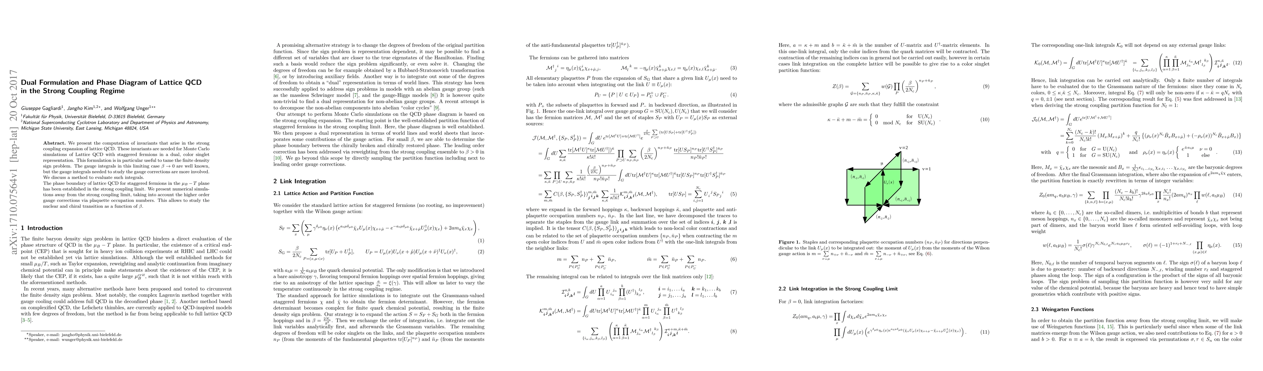 We present the computation of invariants that arise in the strong coupling expansion of lattice QCD. These invariants are needed for Monte Carlo simulations of Lattice QCD with staggered fermions in a dual, color singlet representation. This formulation is in particular useful to tame the finite density sign problem. The gauge integrals in this limiting case $\beta\rightarrow 0$ are well known, but the gauge integrals needed to study the gauge corrections are more involved. We discuss a method to evaluate such integrals. The phase boundary of lattice QCD for staggered fermions in the $\mu_B-T$ plane has been established in the strong coupling limit. We present numerical simulations away from the strong coupling limit, taking into account the higher order gauge corrections via plaquette occupation numbers. This allows to study the nuclear and chiral transition as a function of $\beta$.